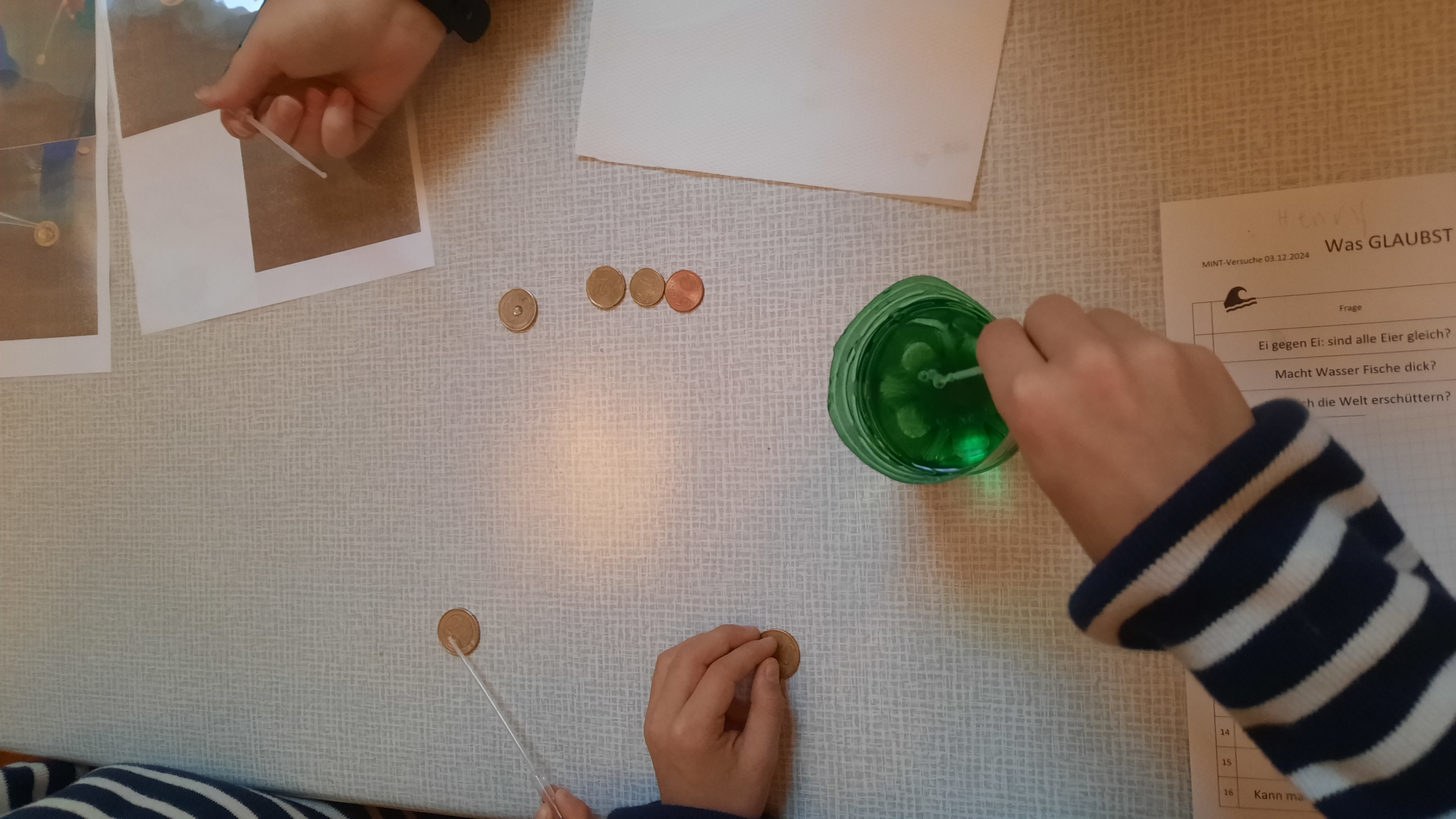 Die MINT-Bereiche des Sachunterrichts plus Mathematik (MINT ist die Abkürzung für Mathematik, Informatik, Naturwissenschaften und Technik) standen für unsere 2. Klassen sowie für unsere 1b im MIttelpunkt: Den Kindern wurden erst "seltsame" Fragen gestellt wie etwa: Kann man auf Luft stehen? Kann Öl im Wasser tanzen? Macht Wasser Fische dick? Und noch viele andere mehr. Nachdem die Vermutungen angestellt waren, ging es in den Festsaal zum Experimentieren. Liebevoll gestaltete Forscherstationen und die engagierten jungen Leute warteten schon auf uns. Die Antworten auf manche Fragen waren dann wirklich überraschend - und auch gut erklärt!