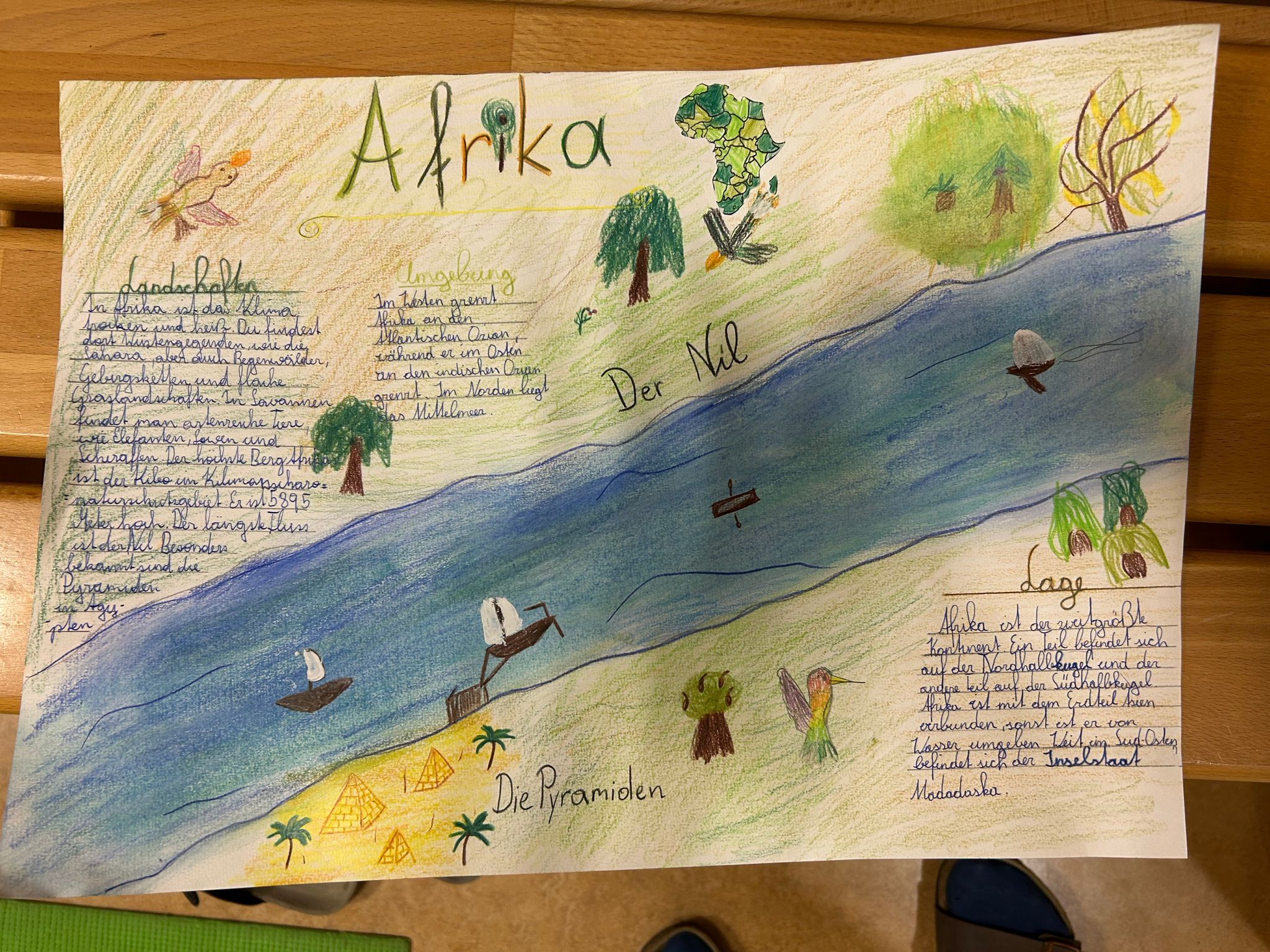 Die Arbeiten, Plakate und Referate, die in Gruppen- und Partnerarbeiten entstanden, können sich sehen lassen - und das Wissen über Afrika, Südamerika usw. sowie verschiedene Länder Europas bleibt "in" den Kindern bestimmt lange gespeichert!
