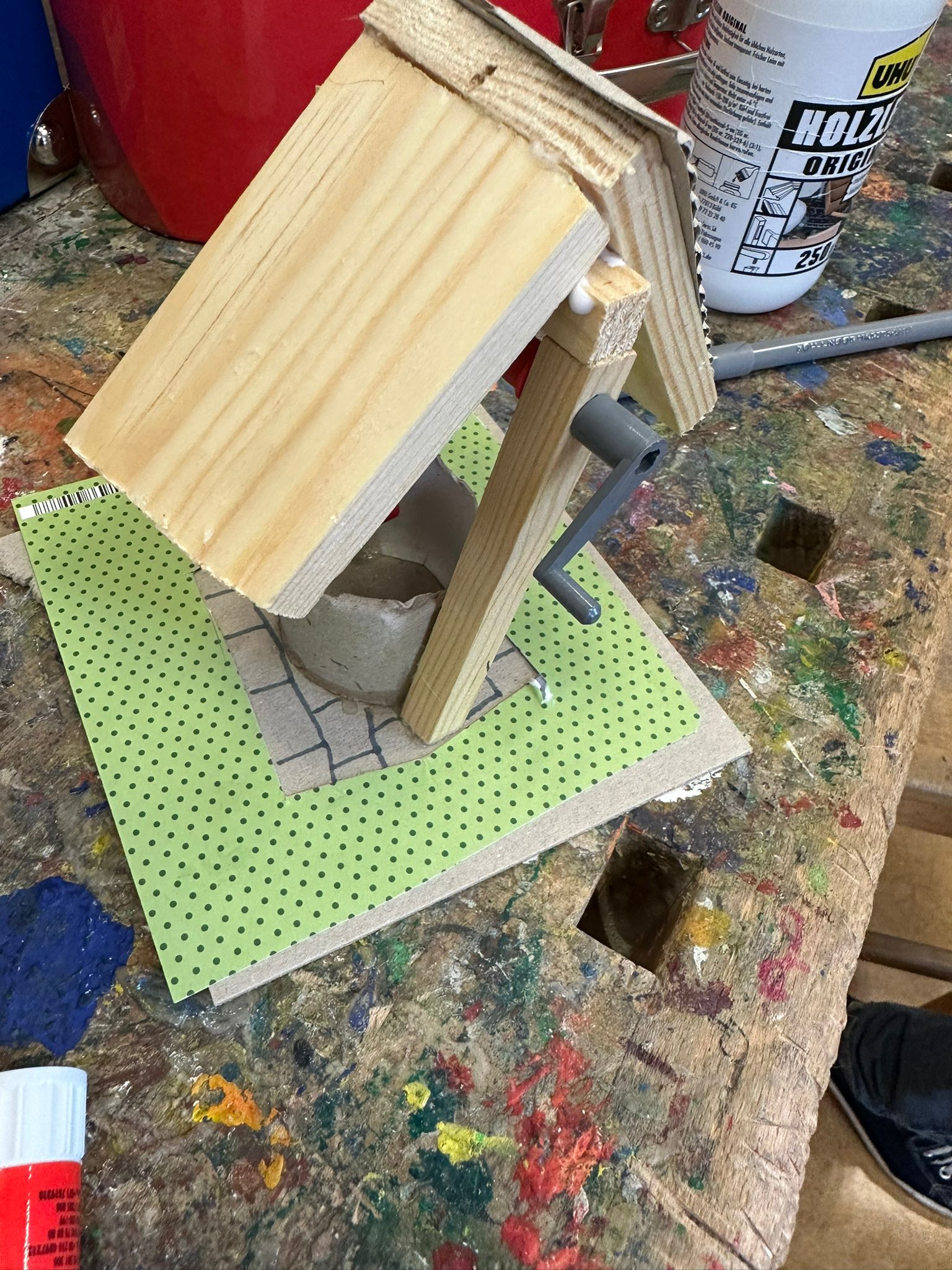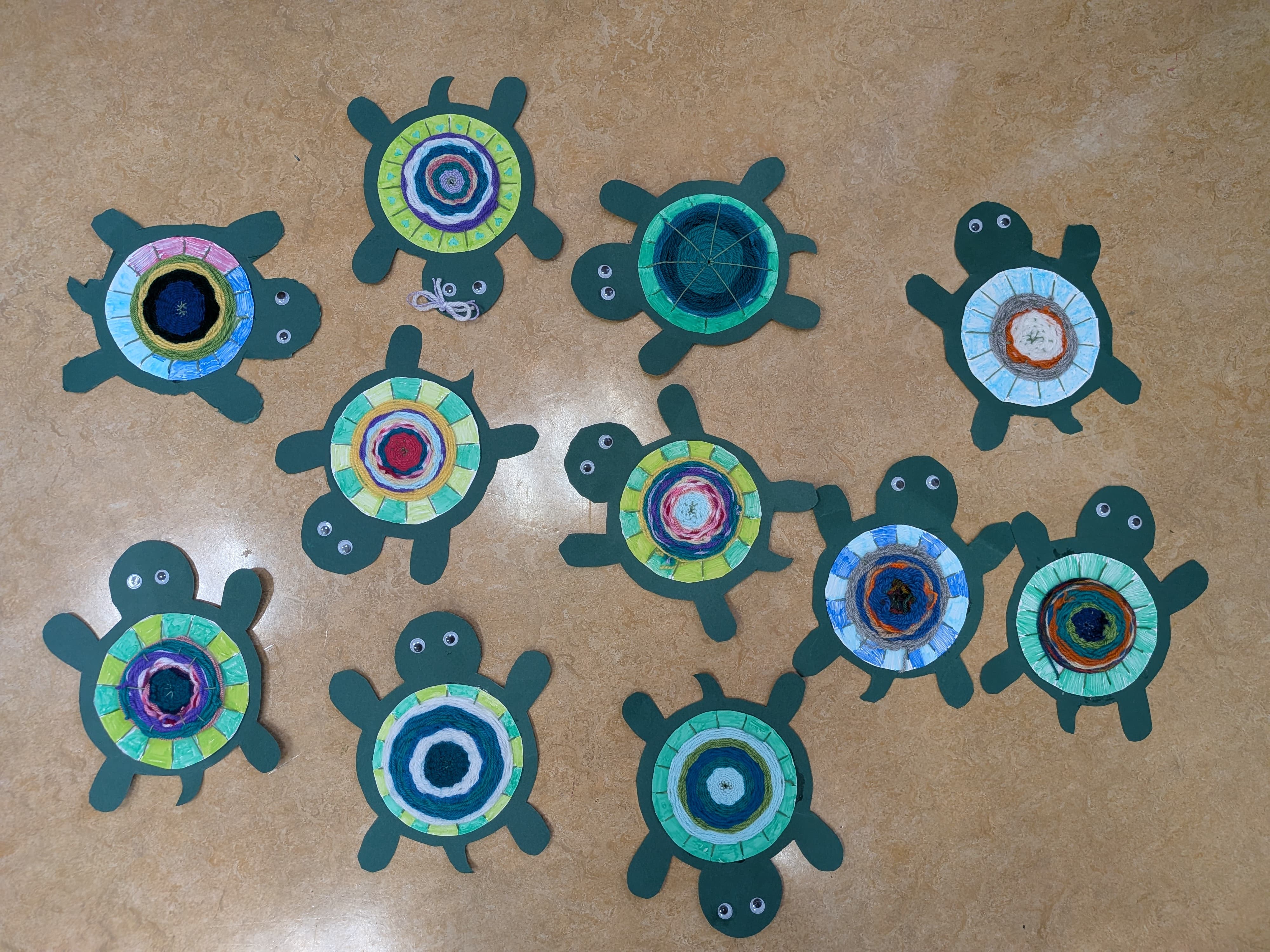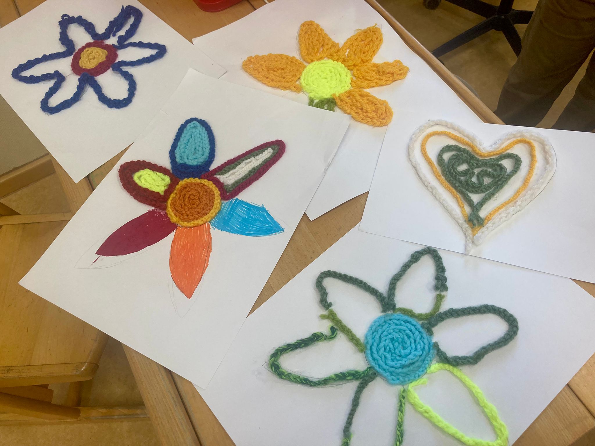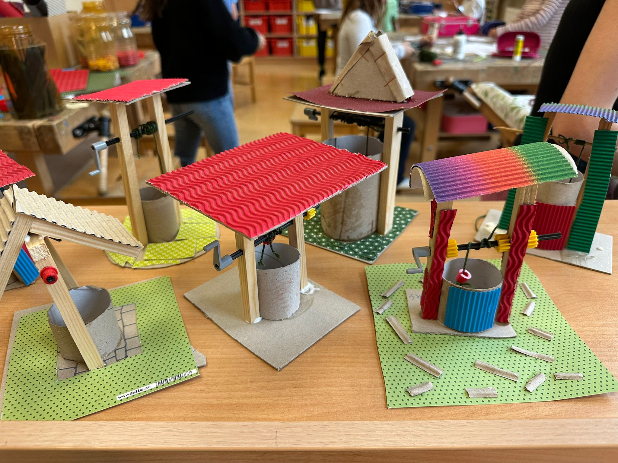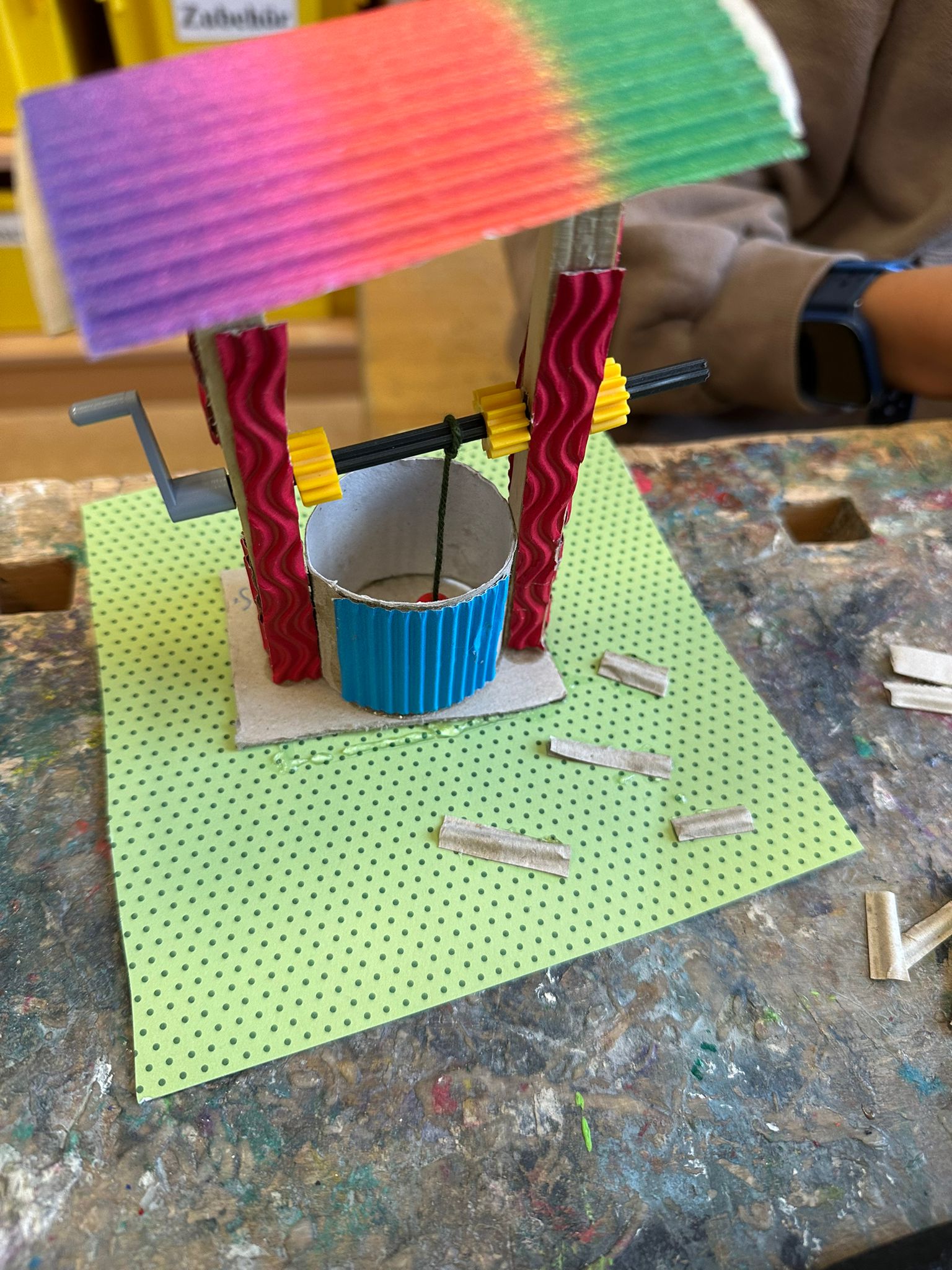 Da haben wir in technischen Werken Labyrinthe in einem Schuhkarton (3B), erfinderisch toll entworfene Ziehbrunnen (4A), nachdem die SchülerInnen überhaupt erst einmal erfahren mussten, was ein Ziehbrunnen überhaupt ist! In textilem Werken lernten die Kinder der 4. Klassen das Rundweben kennen und produzierten entzückende Schildkröten, deren Panzer das Werkstück ist. Unsere 3C widmete sich im September dem Fingerhäkeln und gestaltete witzige Mäuschen und die 3A häkelte mit Häkelnadeln ihre ersten Luftmaschen - hier entstanden die bunten textilen Blumenbilder!
