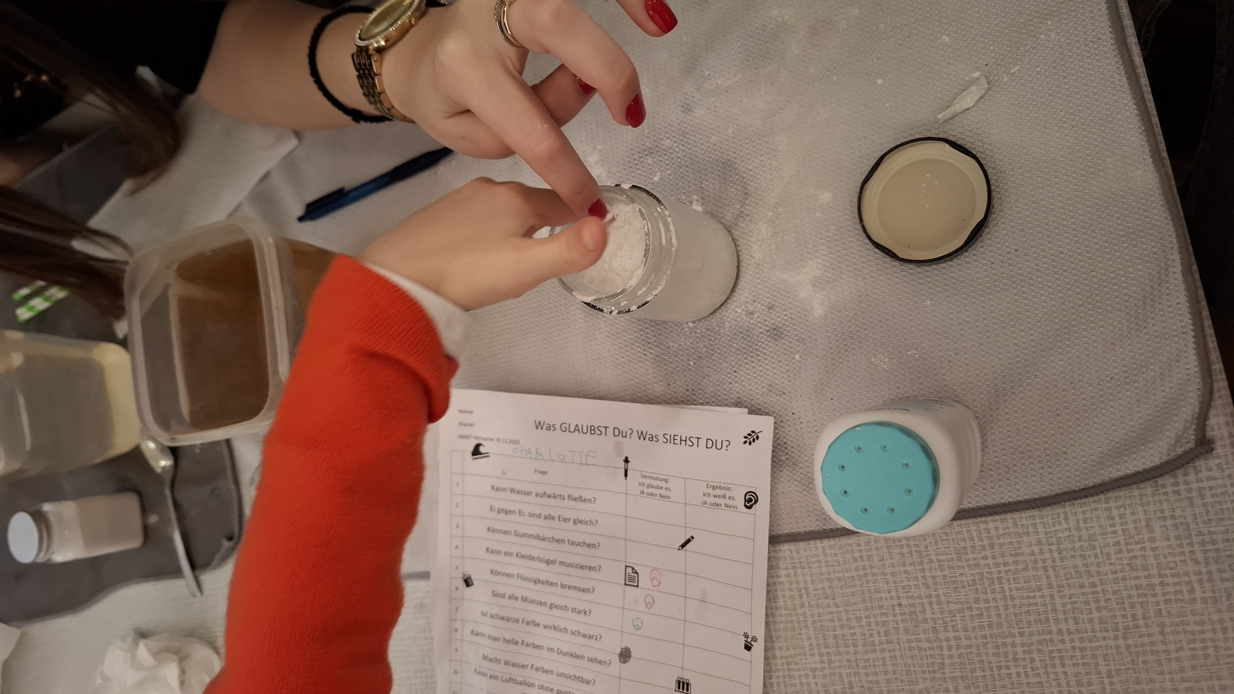 SchülerInnen unserer BAfEP hatten liebevoll und kompetent verschiedene Stationen im Festsaal vorbereitet, an denen unsere ersten Klassen experimentieren konnten: erst die Frage, dann die Hypothese, dann der Versuch und schließlich das Forschungsergebnis. Jetzt wissen wir zum Beispiel. Wasser ist nicht immer nass! Auf Luft kann man stehen! Und noch vieles mehr. Es war großartig! Danke, liebe Campus-PartnerInnen!