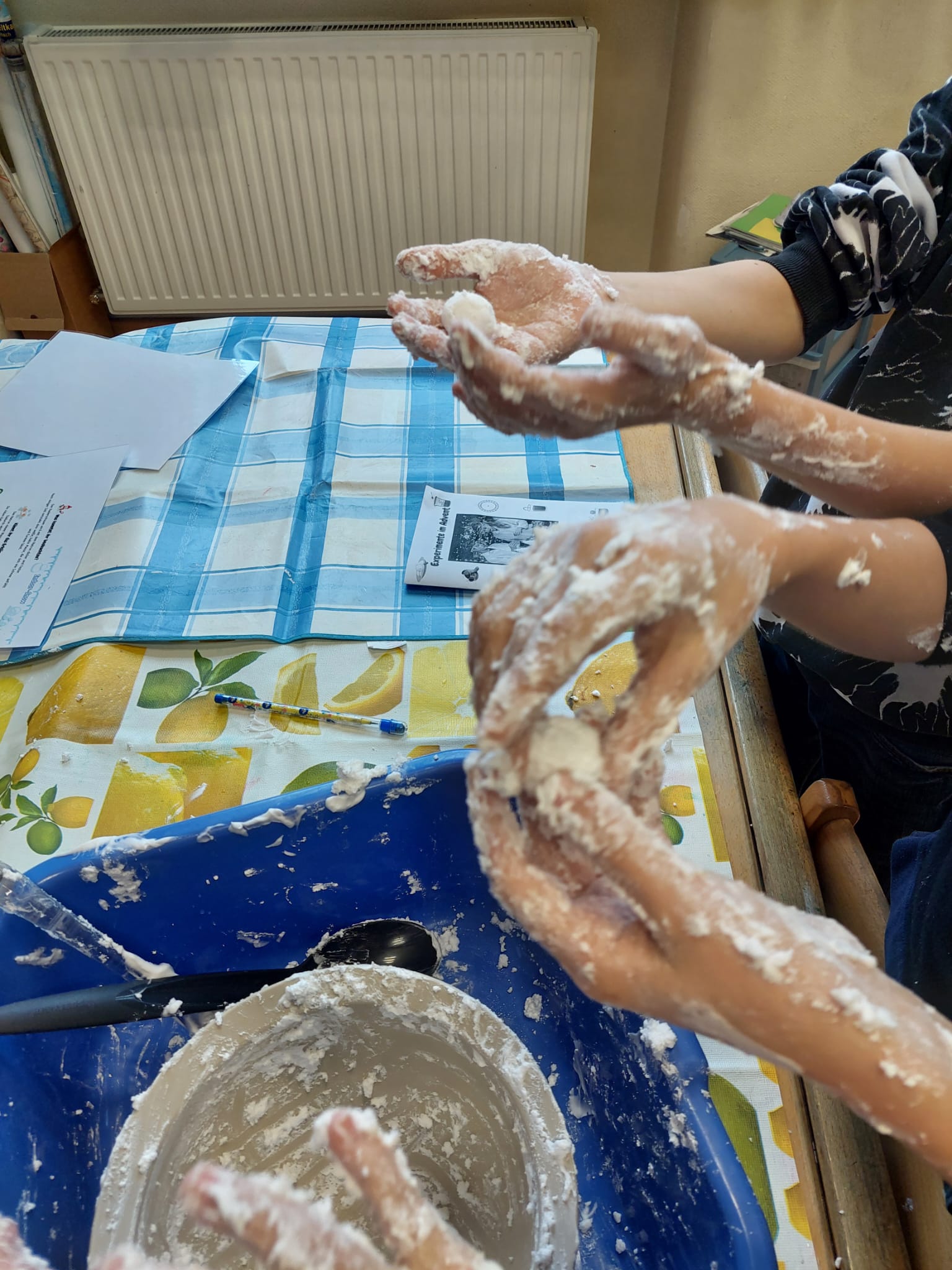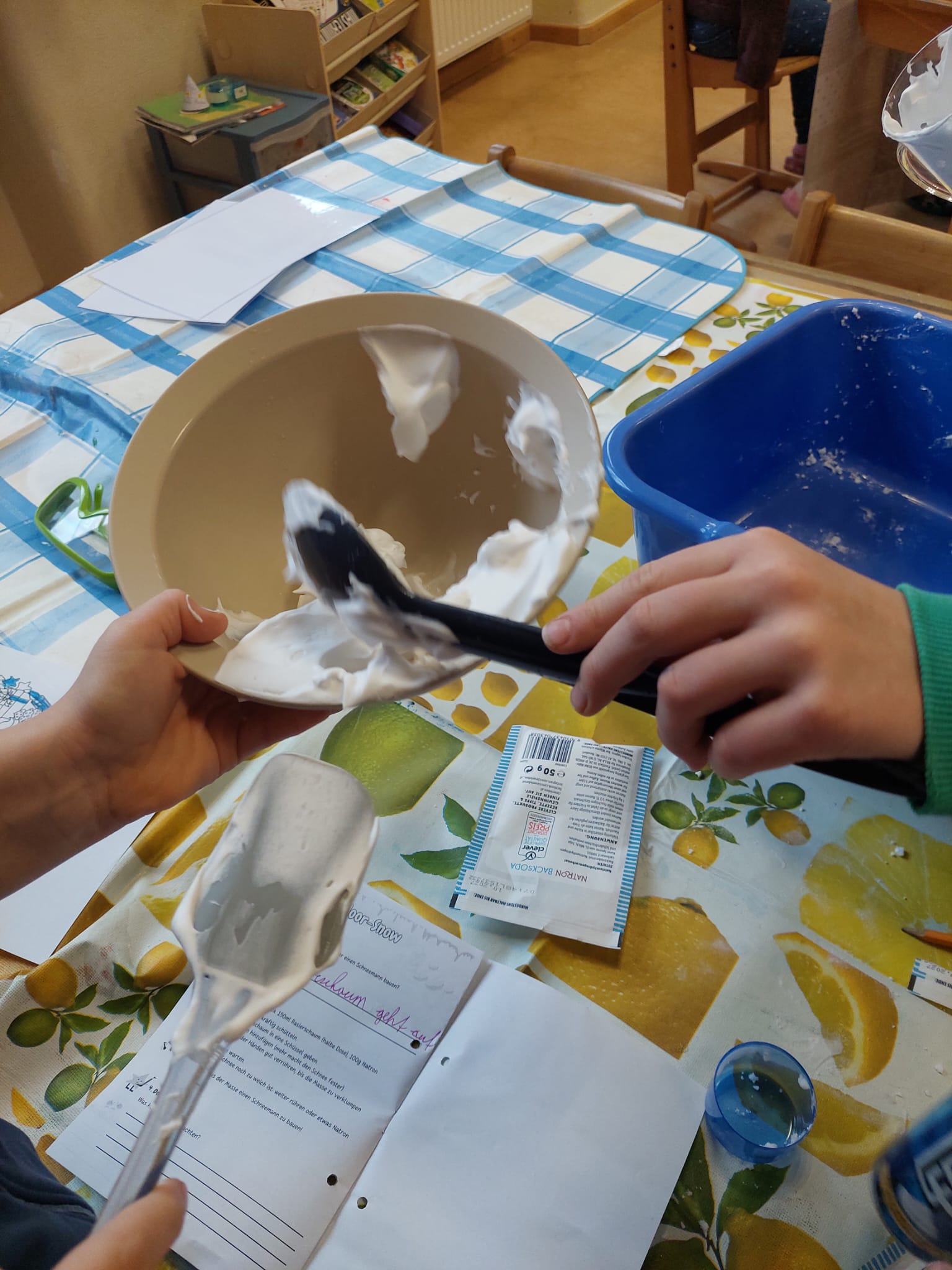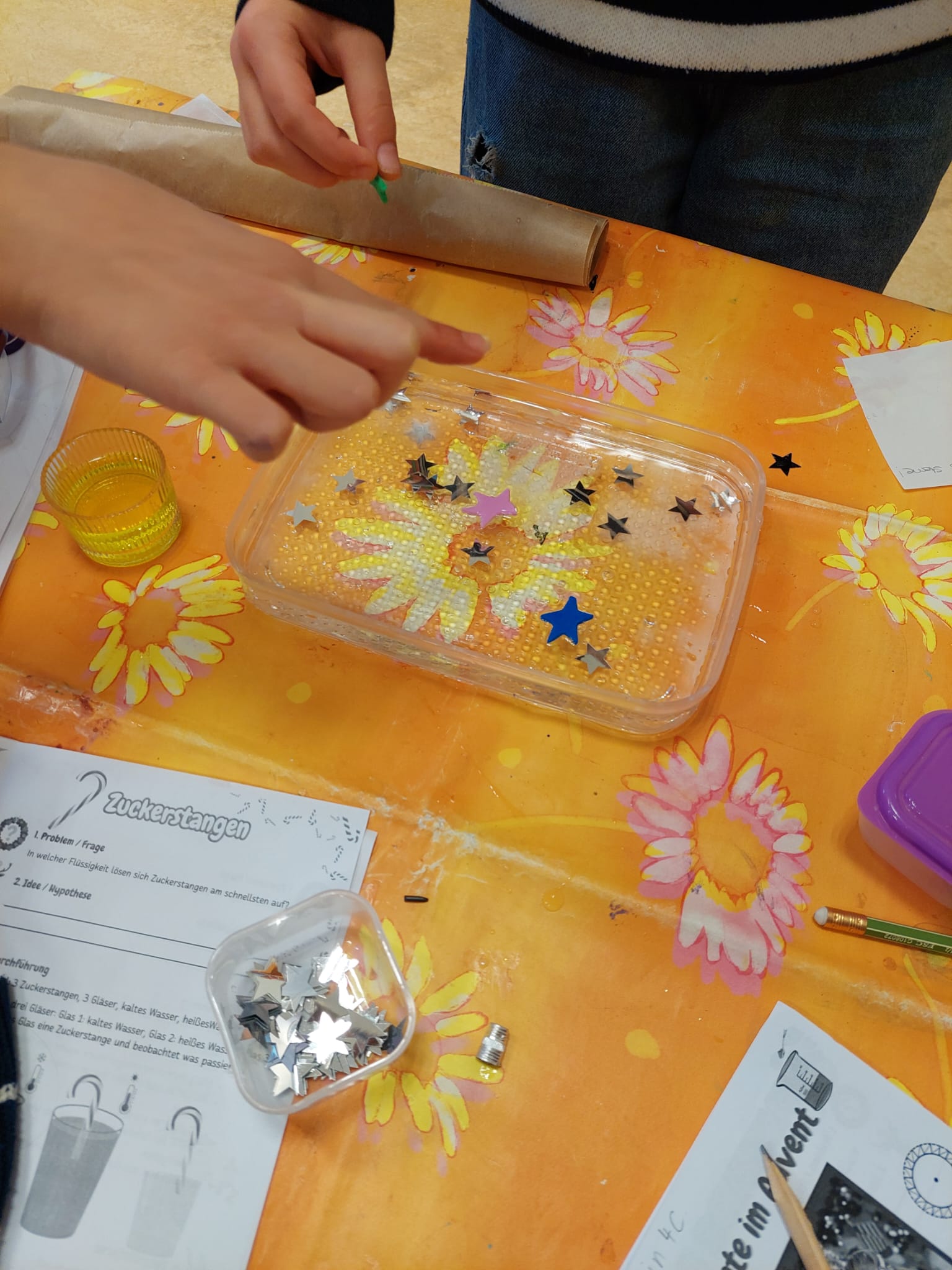 Es war wirklich spannend, was sie dabei entdecken durften: schwimmende und sinkende Mandarinen, die Löslichkeit von Zuckerstangen, tanzende Rosinen und Sterne - und die Kinder stellten selbst Schnee her (schön, denn draußen war der Novemberschnee schon wieder weg ...).