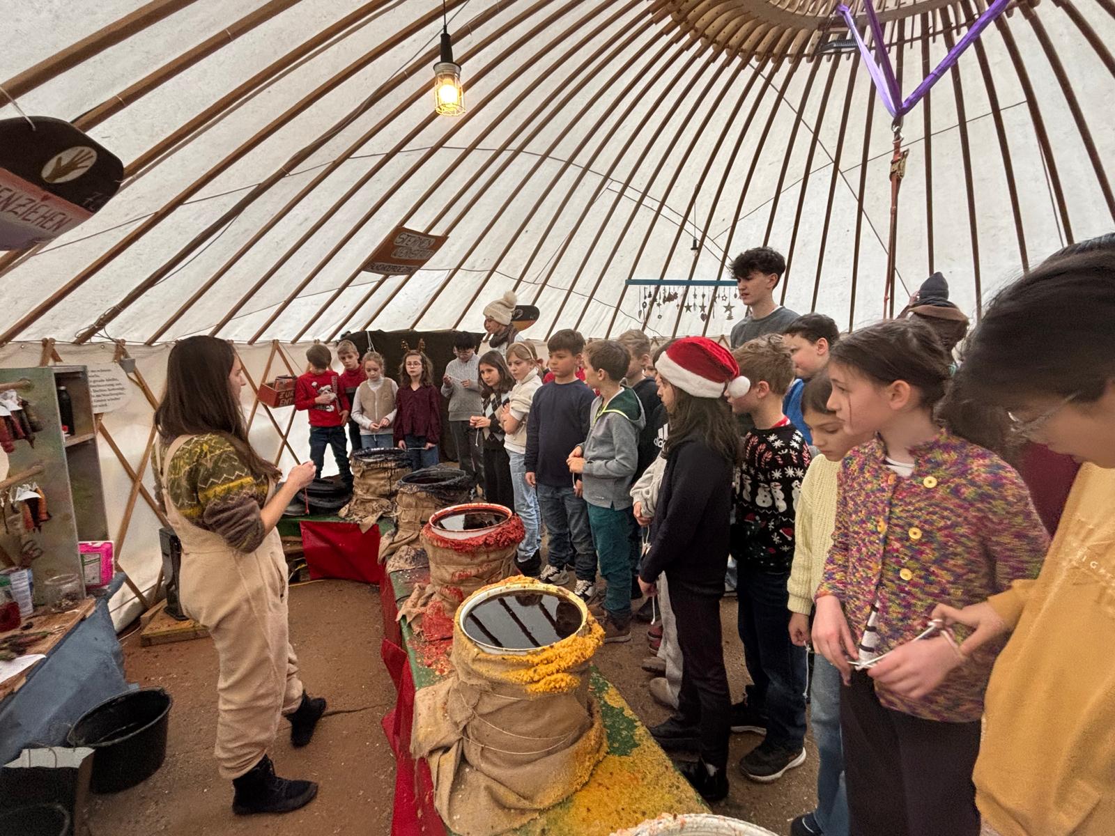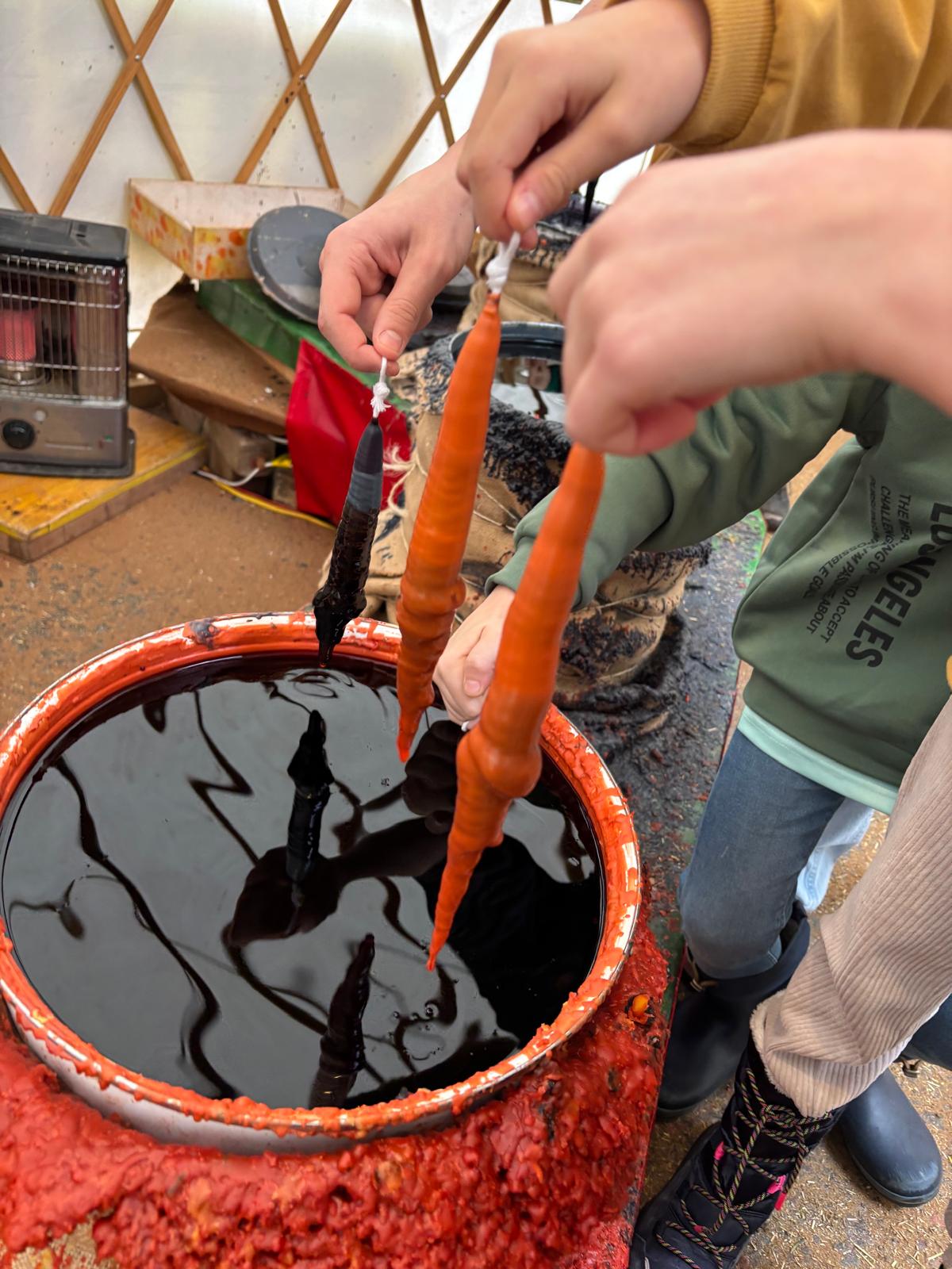 Auf dem Programm stand: Kerzenziehen. In einem gemütlichen Zelt tauchten die Kinder die Kerzendochte mit viel Geduld immer wieder in das heiße, duftende Bienenwachs. Schicht für Schicht entstanden so individuelle Kerzen als perfektes Weihnachtsgeschenk und als Erinnerung an einen gelungenen Ausflug!