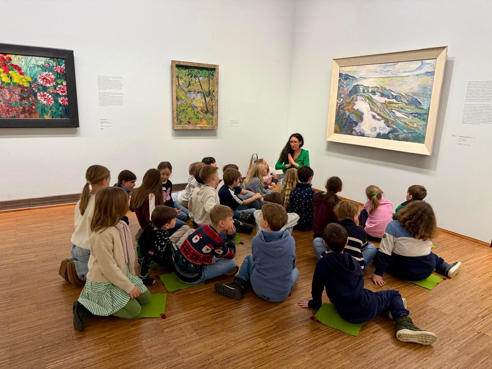 Frau Liszkay führte die Kinder kindgerecht durch ausgewählte Kunstwerke und regte sie mit Fragen und Beobachtungsaufgaben zum Mitdenken an. Die Schüler:innen setzten sich mit Farben, Stimmungen und Darstellung der Jahreszeiten auseinander und beteiligten sich aktiv. Die Kinder zeigten großes Interesse und Freude. Die Führung war für die Klasse ein spannendes und lehrreiches Kunsterlebnis und wir im Februar mit einem Workshop in der Klasse weitergeführt. Sie dürfen schon gespannt sein.