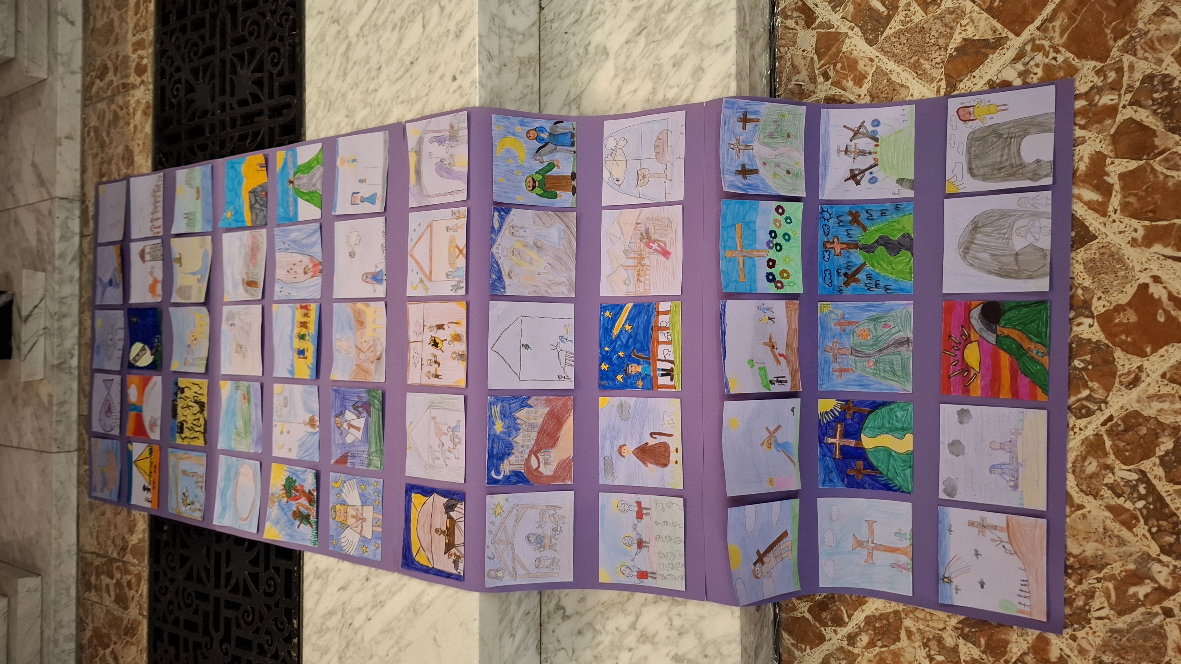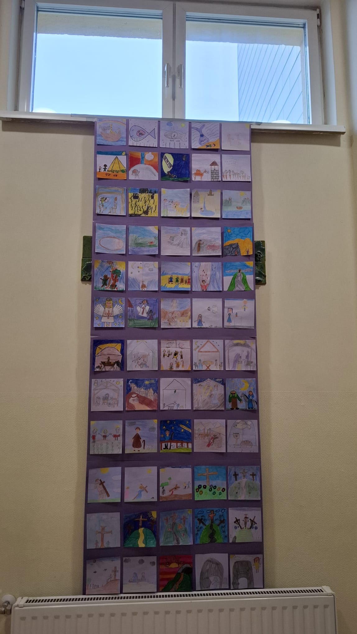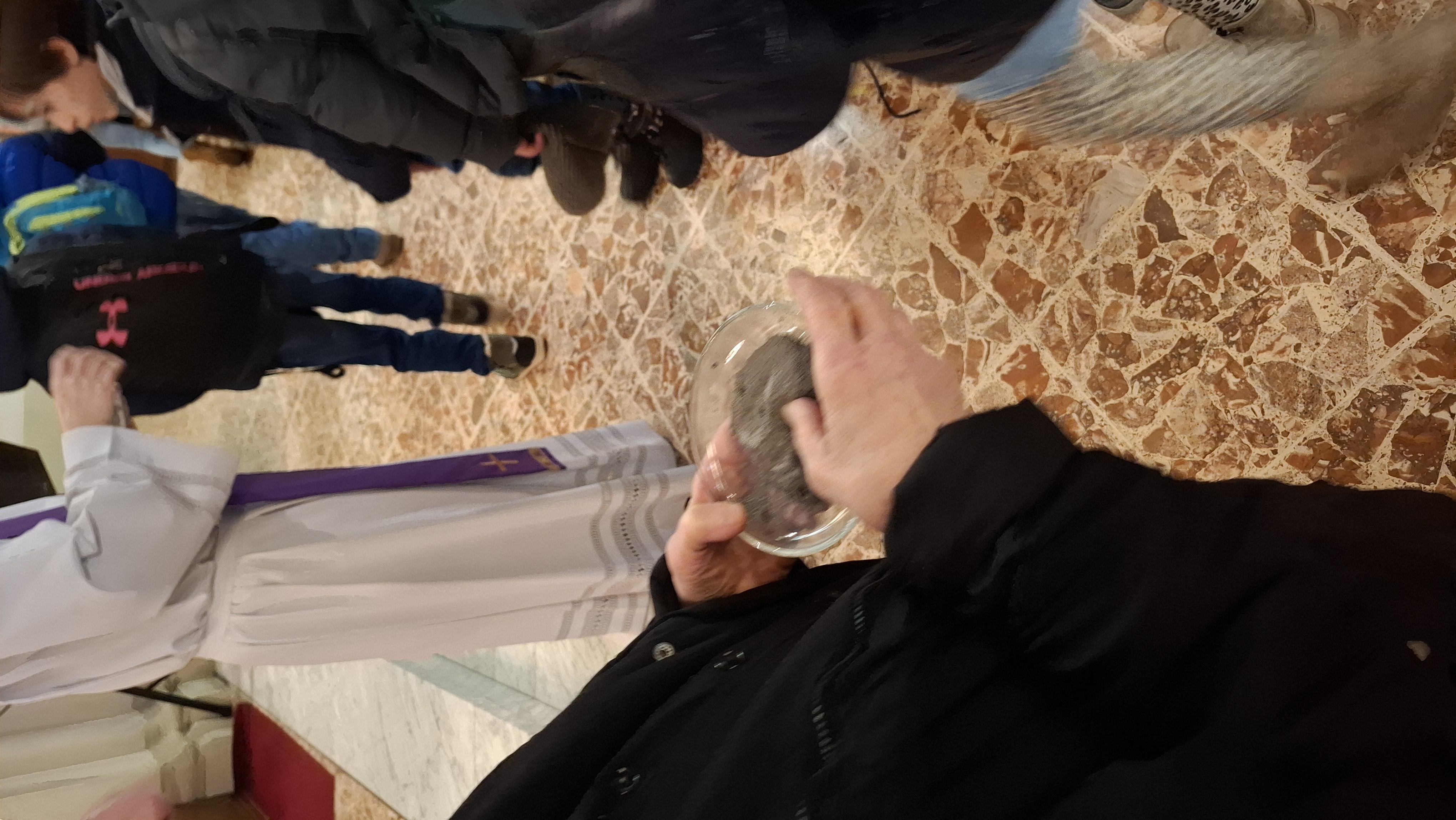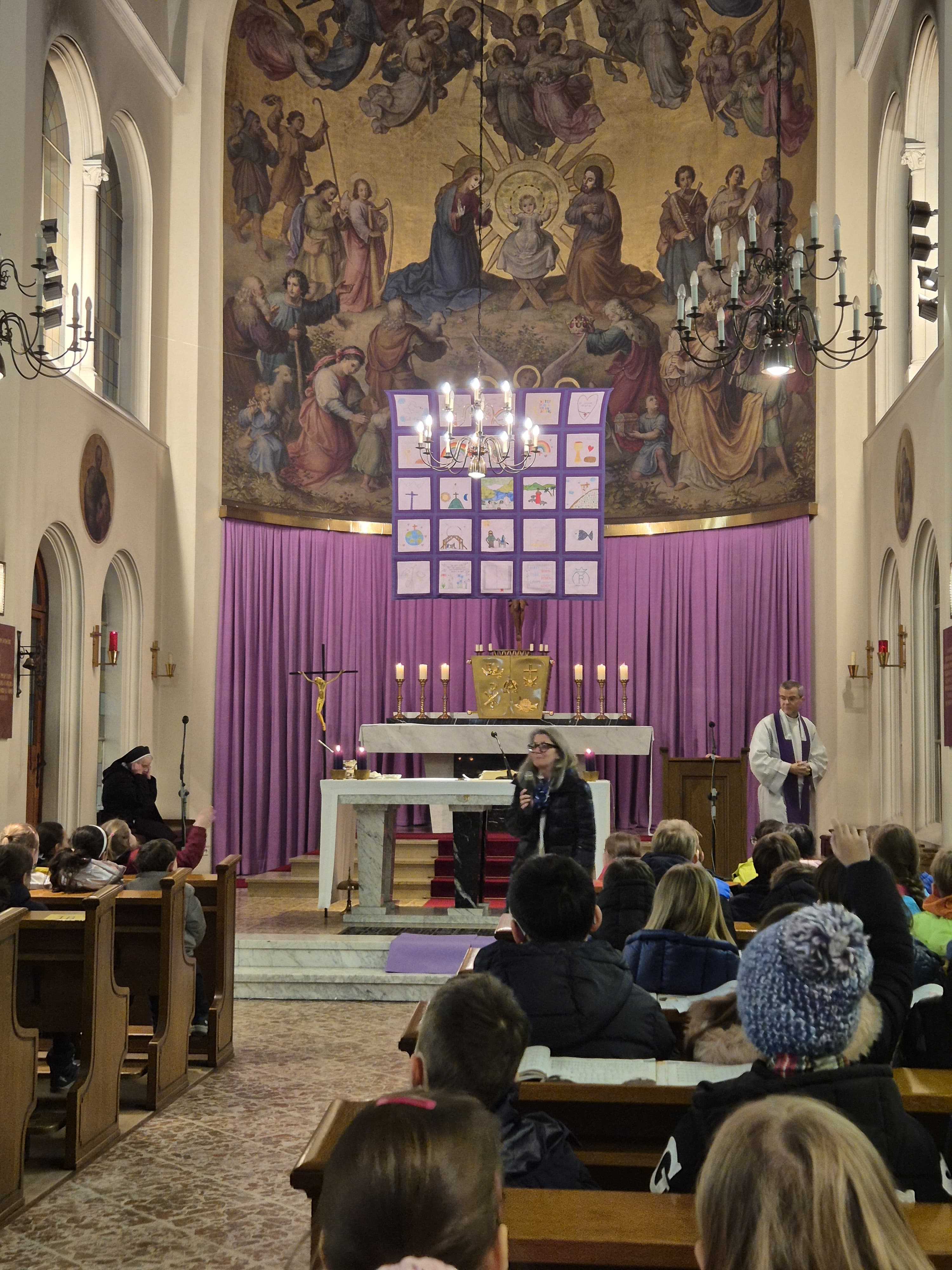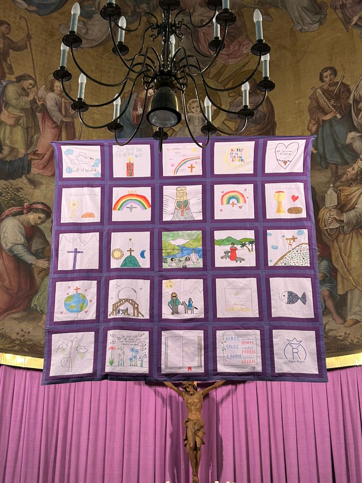 In der Klosterkirche wurde das neue Fastentuch "eingeweiht" und das zusätzliche "Fastentuchplakat" unserer 4. Klassen vorgestellt. Denn rechtzeitig zum Aschermittwoch war beides fertiggestellt! Das Aschenkreuz mit der Asche aus verbrannten Faschinsgirlanden sowie den Palmkätzchen vom letzten Jahr wurde uns als Symbol der Umkehr und des Neubeginns auf die Stirn geschrieben. Nun gehen wir 40 Tage auf Ostern zu!