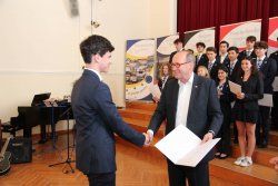 Von unserer Europabotschafterin Martina Schwarz bedankt wurde auch der scheidende EU Juniorbotschafter Rafael Ungvari für seinen hervorragenden Einsatz in der schwierigen Pandemiezeit. Die musikalische Gestaltungen übernahmen MMag. Winkler (Violine) und Mag. Zuba (Klavier) mit einem Stück von Telemann. Den Abschluss der Feierstunde bildeten Worte von Schulsprecherin Dalar Alexandrian und die Europahymne, Anschließen wurde zu einem Empfang gebeten.