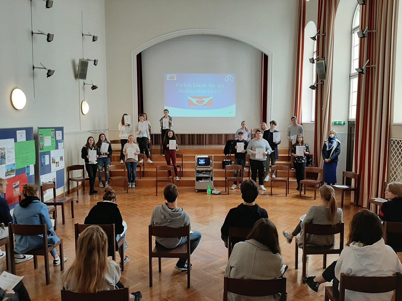 Spät im Jahr und in kleinem Rahmen fand heuer die Compassion Präsentation statt. Statt einer Präsentation gab es drei: Jede 8. Klasse stellte einer 7. Klasse das Projekt vor. So konnten alle teilnehmenden Schülerinnen und Schüler ihre Erfahrungen an andere weitergeben. Auch die Teilnahmezeugnisse wurden überreicht.