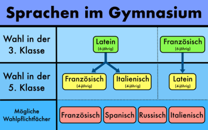 - Die erste lebende Fremdsprache, Englisch, wird ab der 1. Klasse unterrichtet. Ab der 3. Klasse (7. Schulstufe) besteht die Wahlmöglichkeit zwischen den Schularbeitsfächern Latein und Französisch (jeweils 6-jährig). Wer sich für Langfranzösisch entscheidet, hat Latein erst ab der 5. Klasse (9. Schulstufe); Langlateinerinnen und Langlateiner hingegen können sich ab der Oberstufe für Französisch oder Italienisch entscheiden.