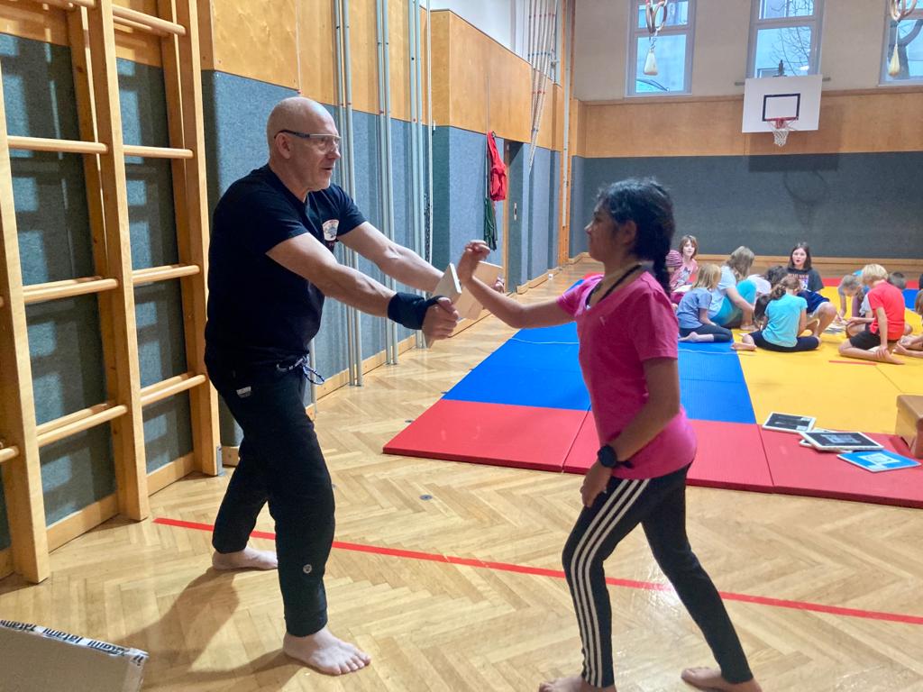 Das Sicherheitstraining für unsere Kinder, in dem sie lernen, sich selbst vor Gewalt und Übergriffen zu schützen, wird von unserem Elternverein finanziell unterstützt. In gezielten Übungen werden die SchülerInnen kindgerecht auf mögliche Gefahren hingewiesen, und sie lernen, sich gegebenenfalls verteidigen, bemerkbar machen oder sichere Orte erkennen zu können. Der Elternabend unseres Referenten, Ferry Kainz, war sehr gut besucht – das Thema bewegt. Und es macht Kinder stark – wie die 4. Klassen in der letzten Einheit bewiesen!