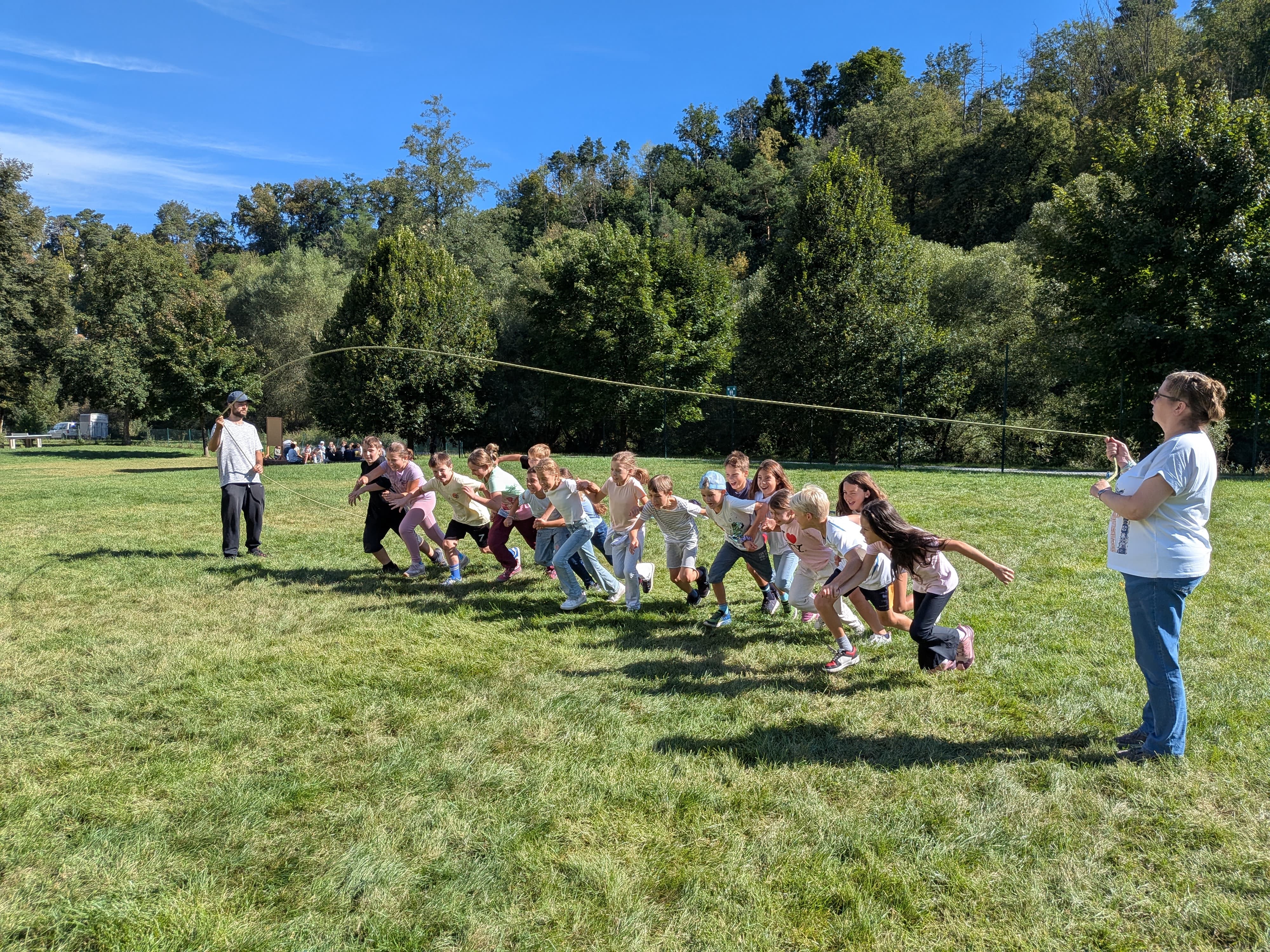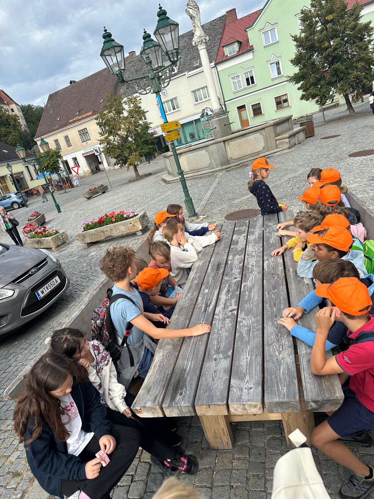 Am Mittwoch konnten nicht alle gleichzeitig in die Trafik, um Karten zu kaufen, also setzten wir uns gemütlich auf den Hauptplatz und lernten, welche Geschäfte in der alten Zeit unbedingt in jeder noch so kleinen Stadt notwendig waren. Wenige sind noch aktiv, von anderen konnten wir noch die Aufschriften an den Häusern sehen. Am Mittwochnachmittag und am Donnerstag fanden viele Aktionen statt, um den Zusammenhalt innerhalb der Klassen zu stärken. Die Kinder zeigten sich als gute Teams.