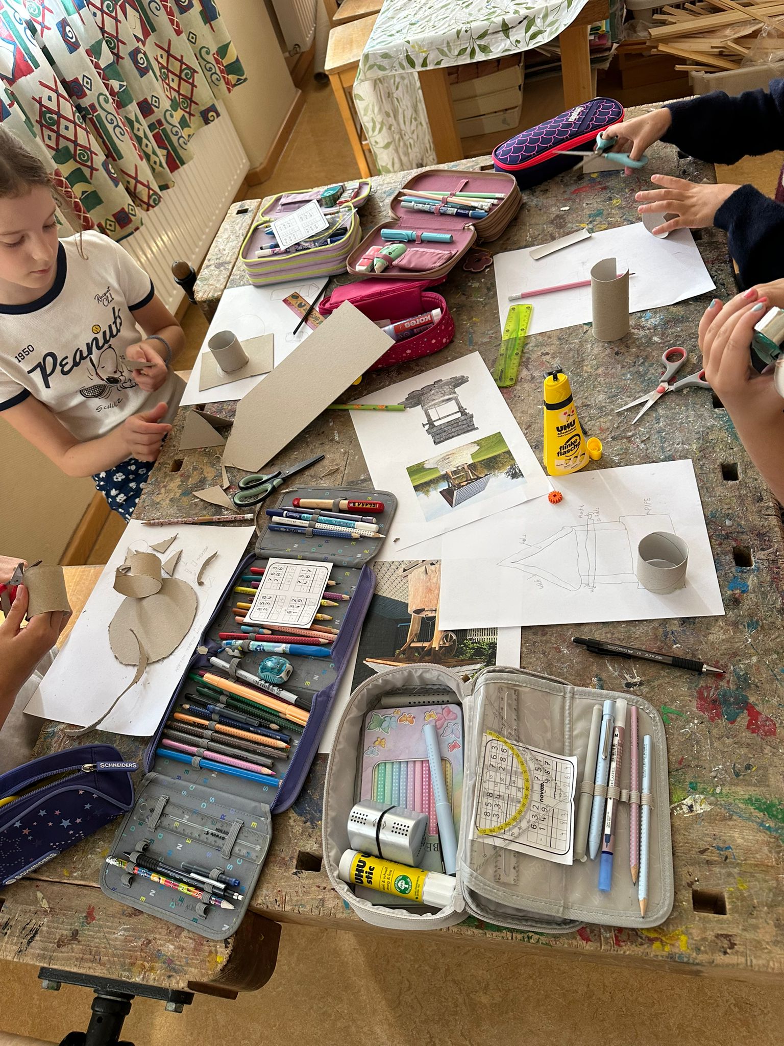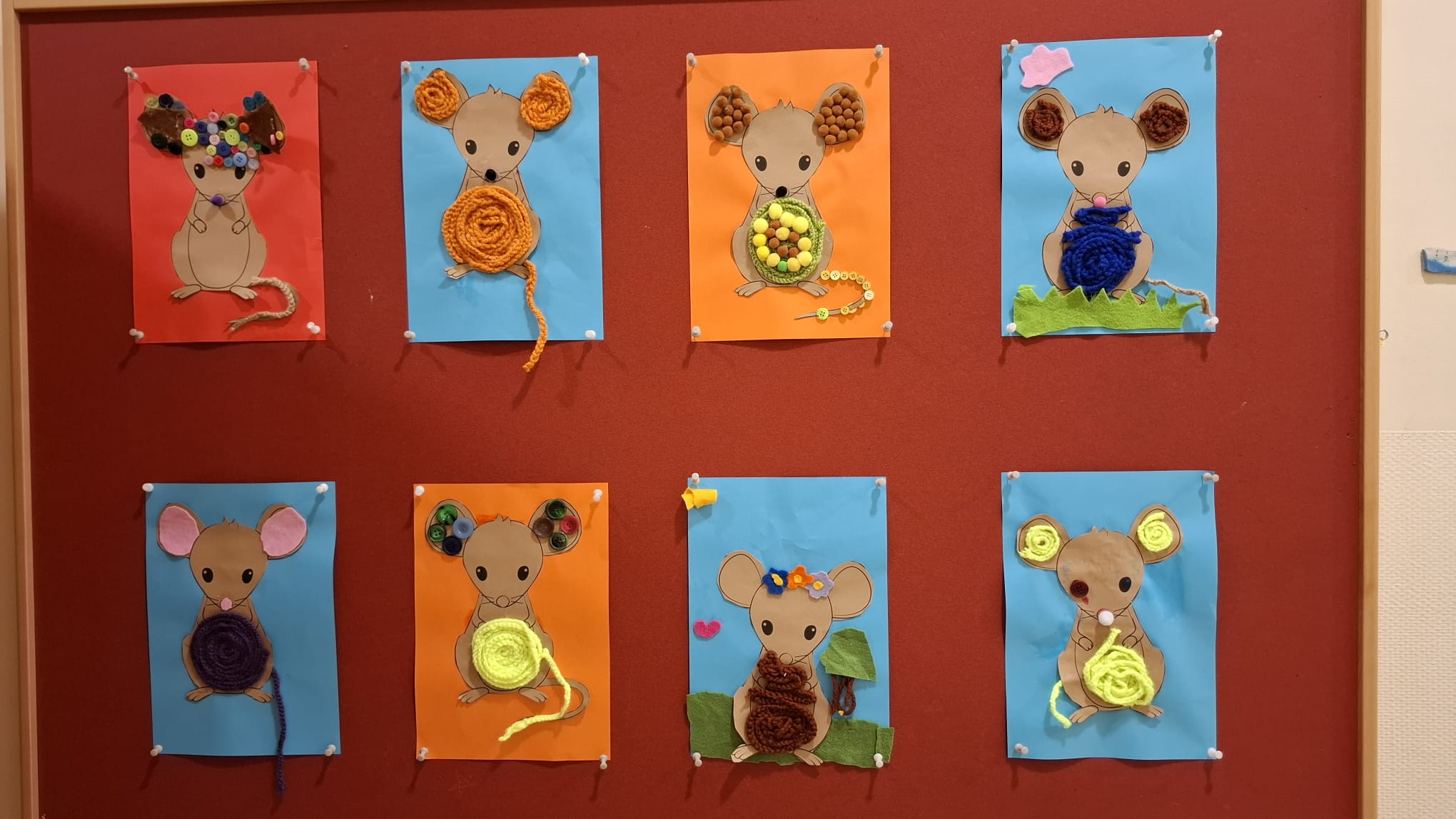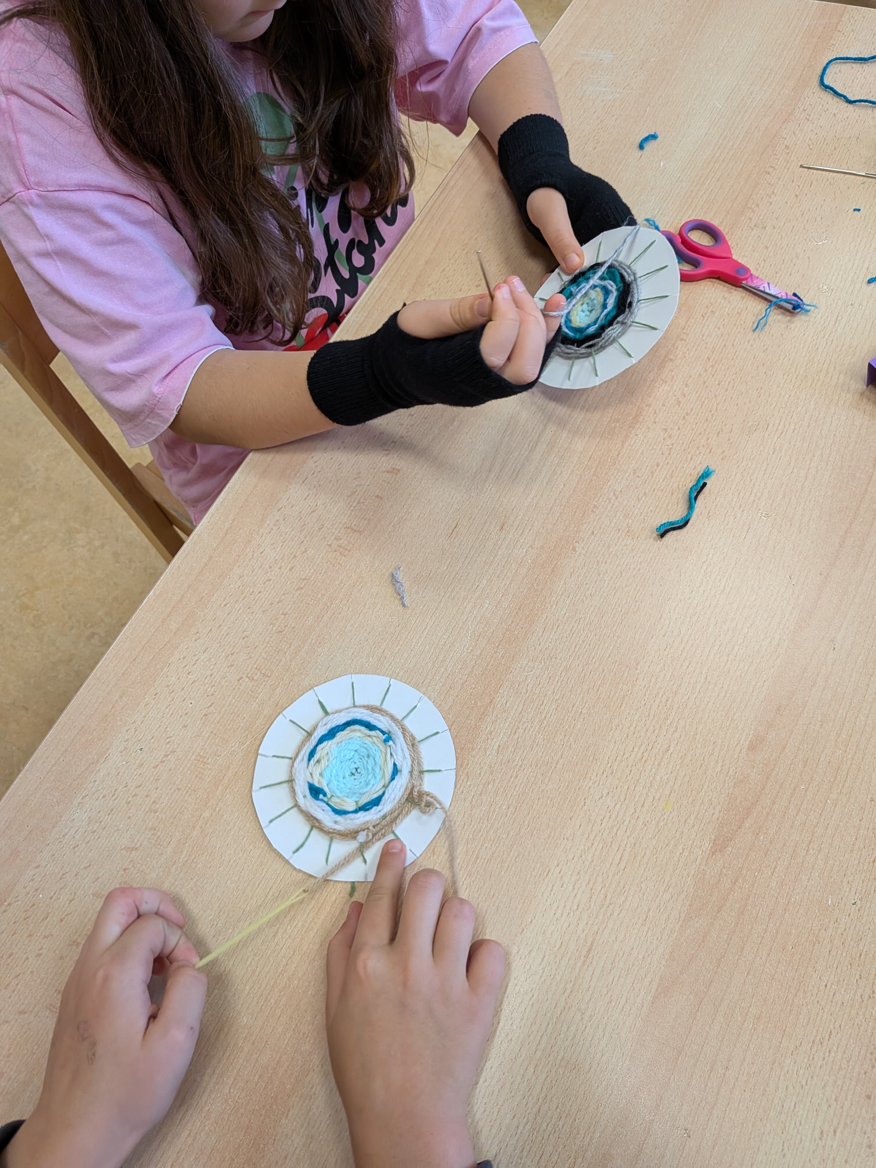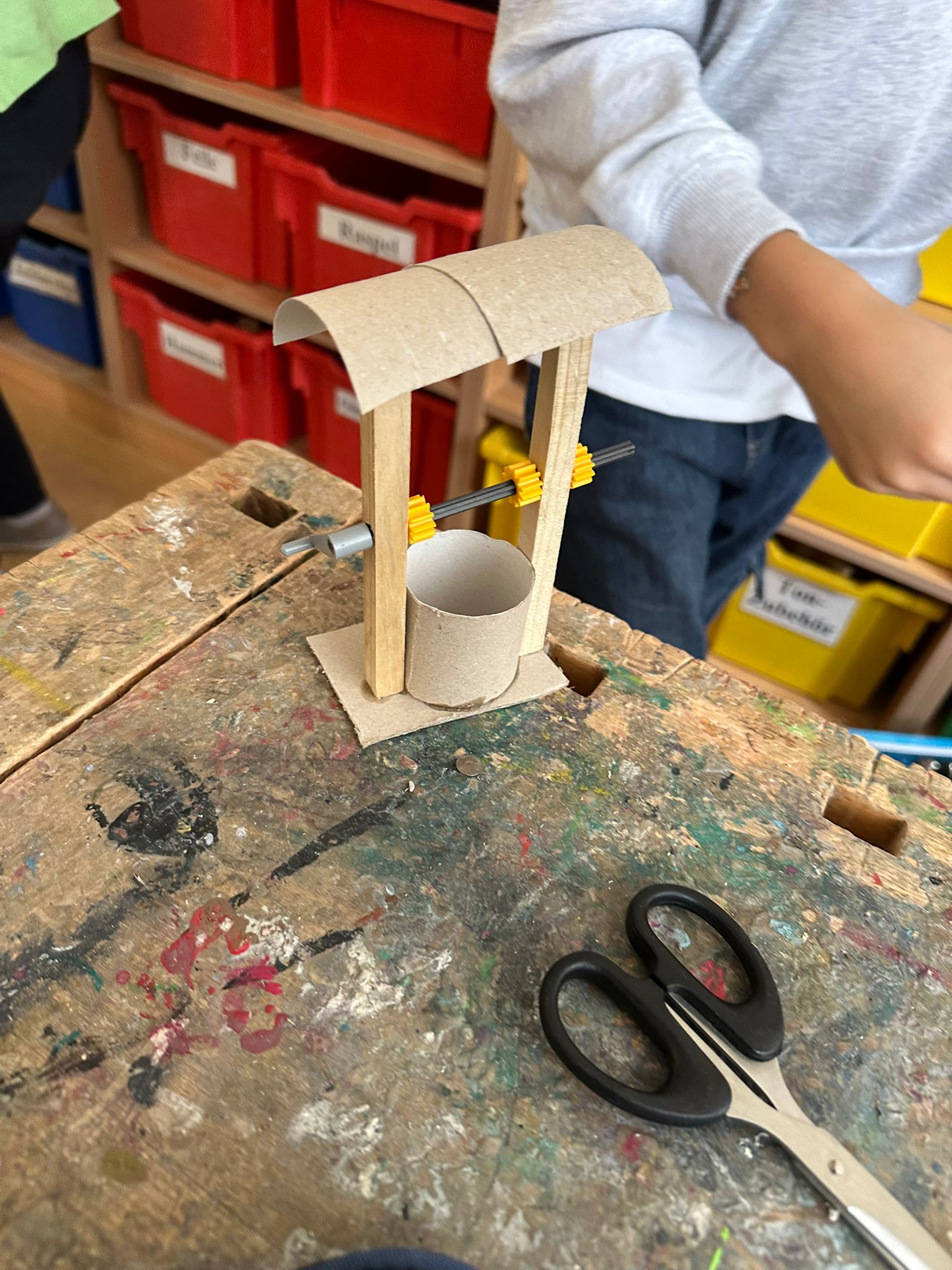 Da haben wir in technischen Werken Labyrinthe in einem Schuhkarton (3B), erfinderisch toll entworfene Ziehbrunnen (4A), nachdem die SchülerInnen überhaupt erst einmal erfahren mussten, was ein Ziehbrunnen überhaupt ist! In textilem Werken lernten die Kinder der 4. Klassen das Rundweben kennen und produzierten entzückende Schildkröten, deren Panzer das Werkstück ist. Unsere 3C widmete sich im September dem Fingerhäkeln und gestaltete witzige Mäuschen und die 3A häkelte mit Häkelnadeln ihre ersten Luftmaschen - hier entstanden die bunten textilen Blumenbilder!