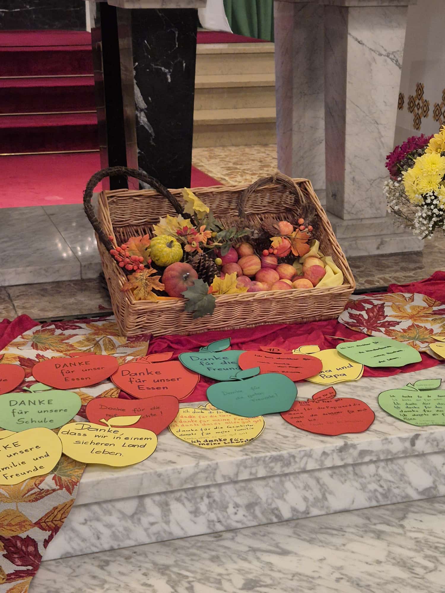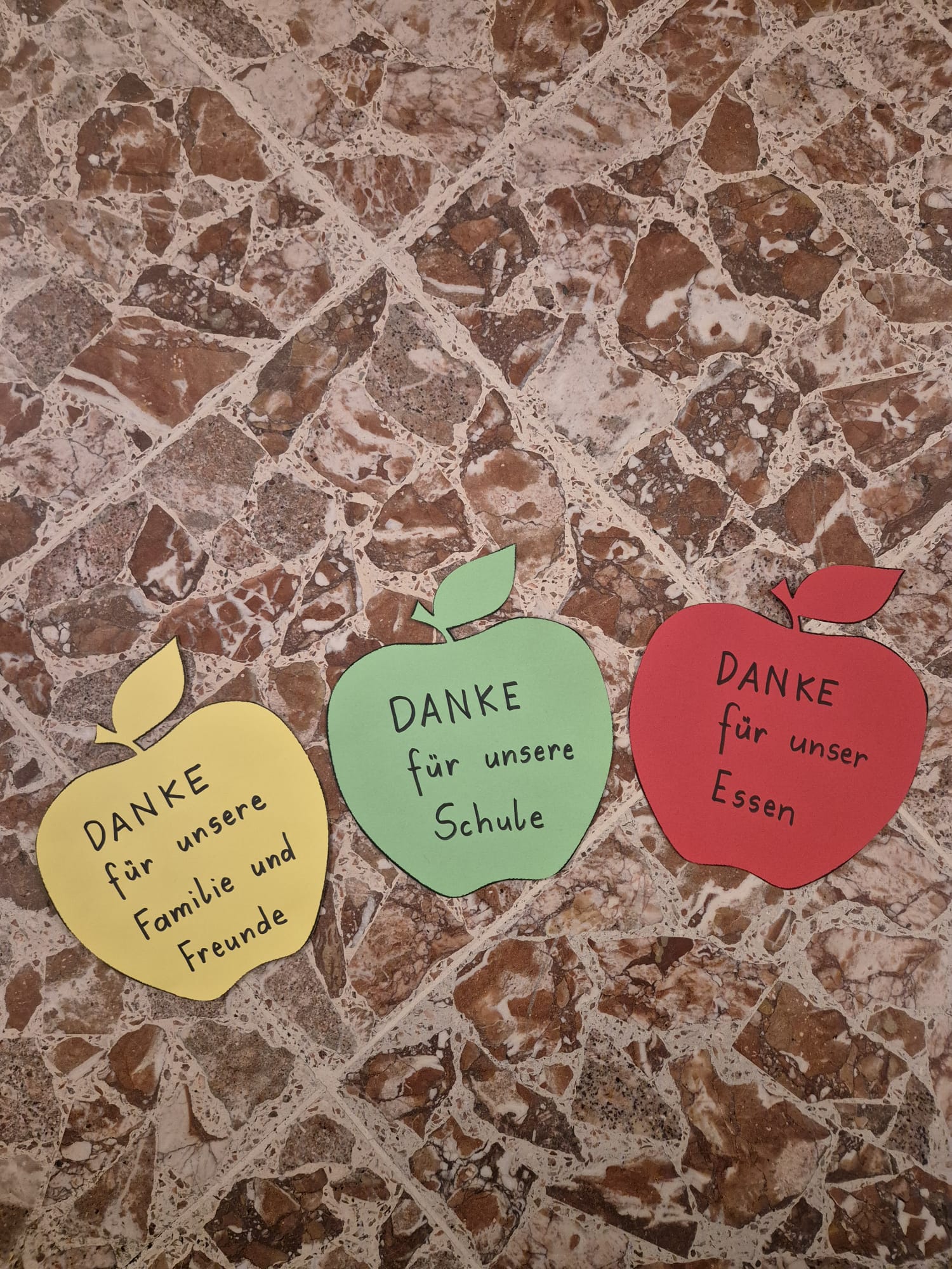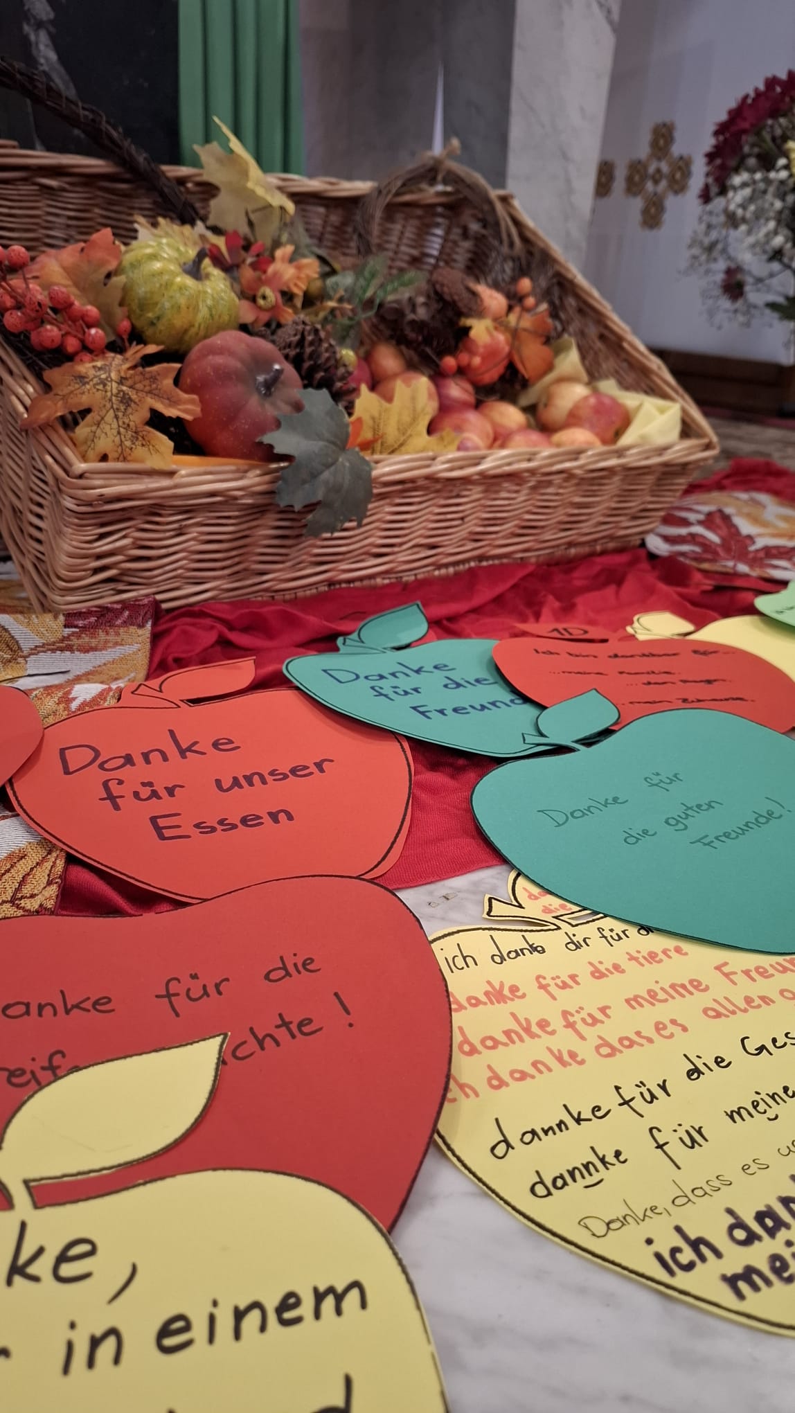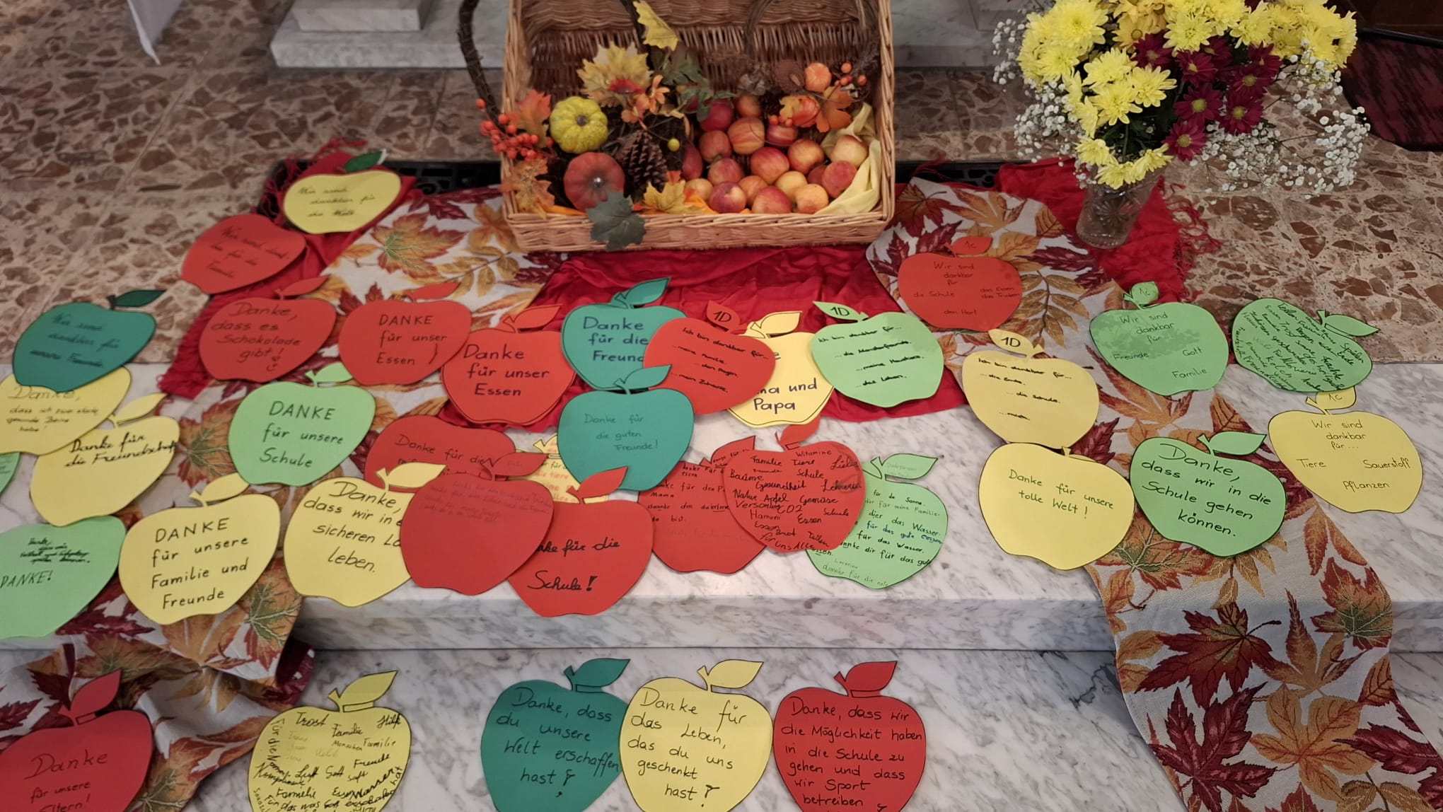 Es gab eine Eröffnung der Woche mit einem Morgenlob, wir legten Naturmandalas und beschäftigten uns im Sachunterricht mit den Früchten des Feldes, der Bäume und Sträucher. Danke sagen wir für alles, was wir haben, die Nahrung, die Familien und Freunde, die Schule und besonders auch für den Frieden, in dem wir leben dürfen. Zum Abschluss der Woche feierten wir einen ökumenischen Dankgottesdienst.