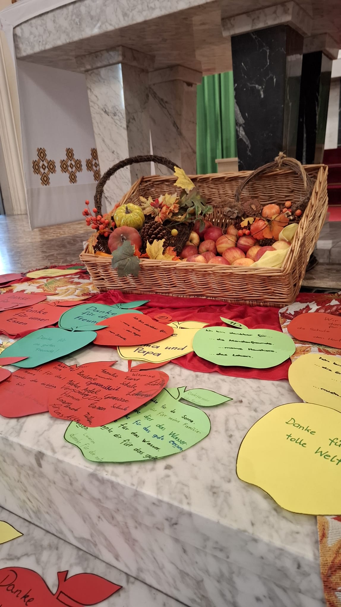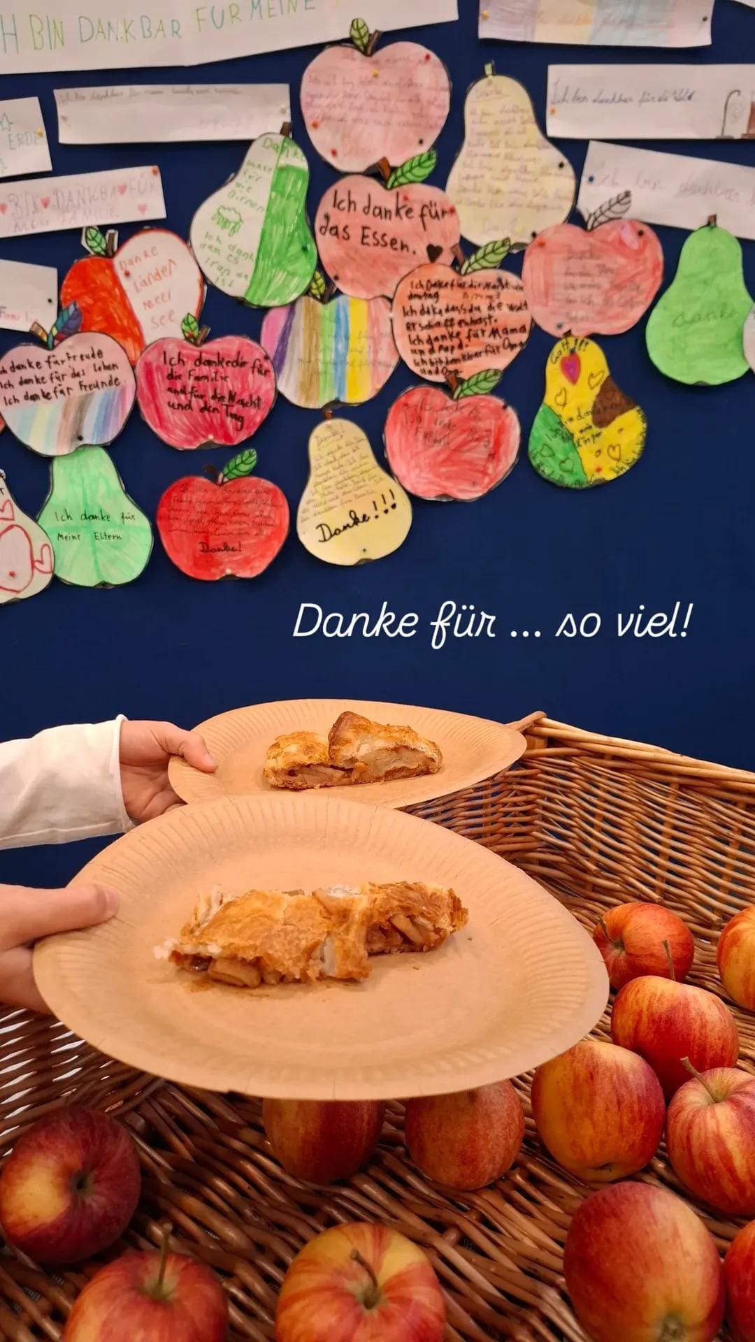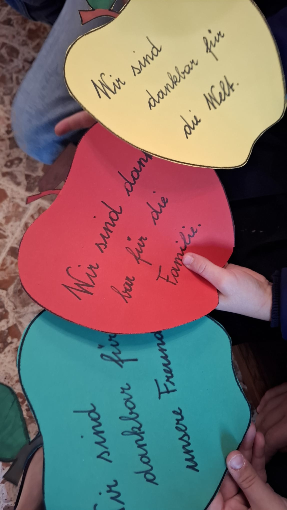 Es gab eine Eröffnung der Woche mit einem Morgenlob, wir legten Naturmandalas und beschäftigten uns im Sachunterricht mit den Früchten des Feldes, der Bäume und Sträucher. Danke sagen wir für alles, was wir haben, die Nahrung, die Familien und Freunde, die Schule und besonders auch für den Frieden, in dem wir leben dürfen. Zum Abschluss der Woche feierten wir einen ökumenischen Dankgottesdienst.