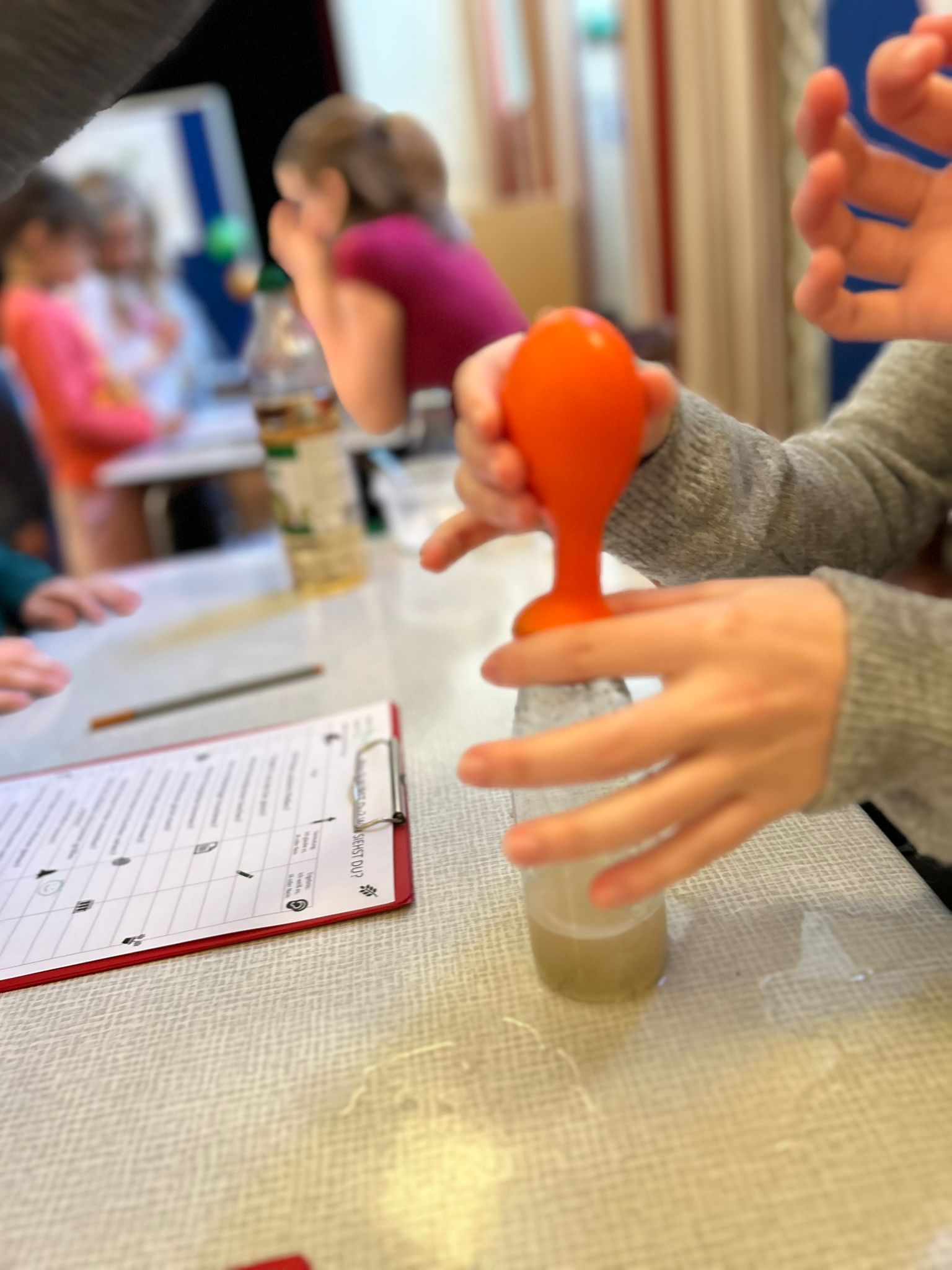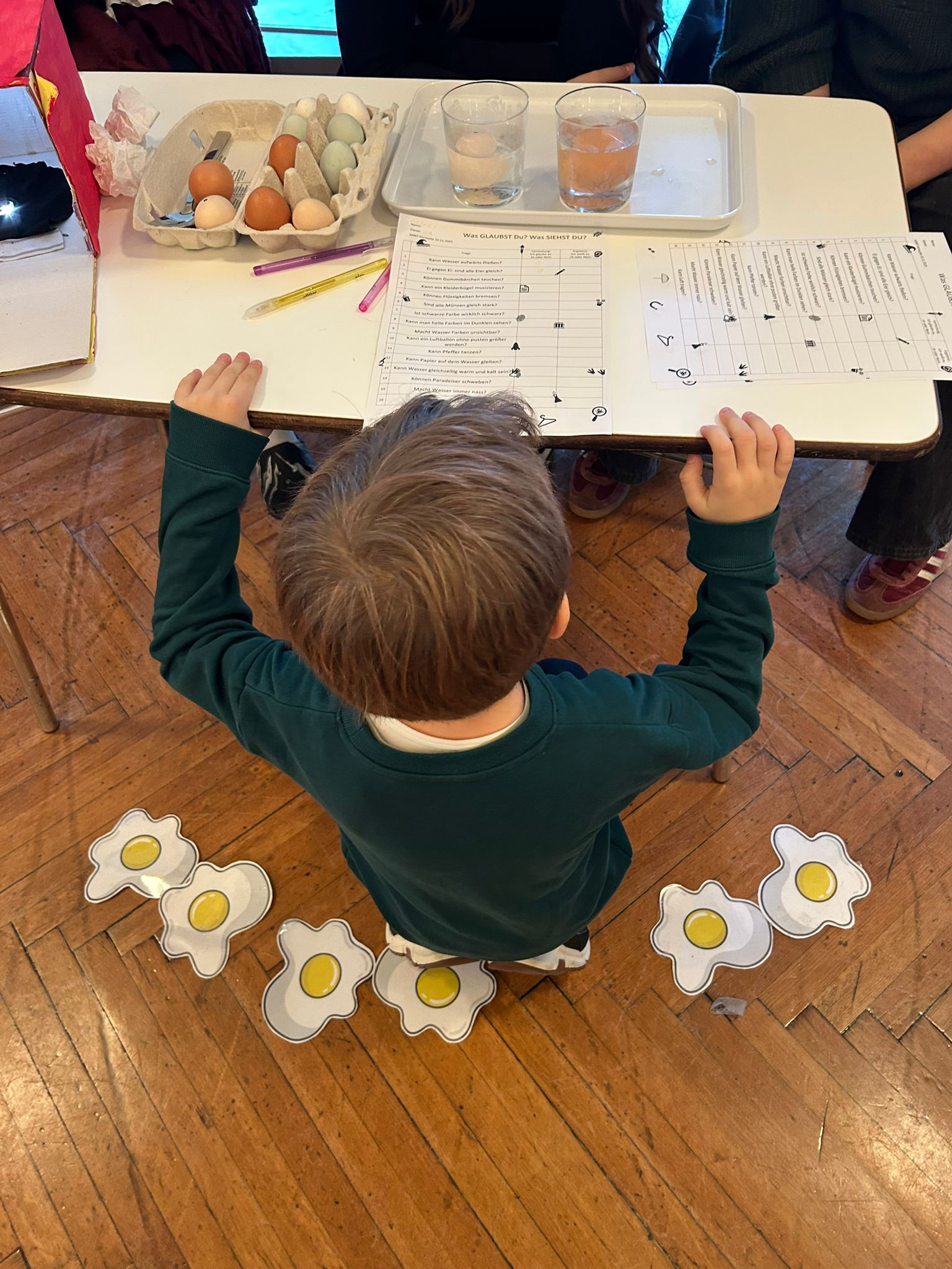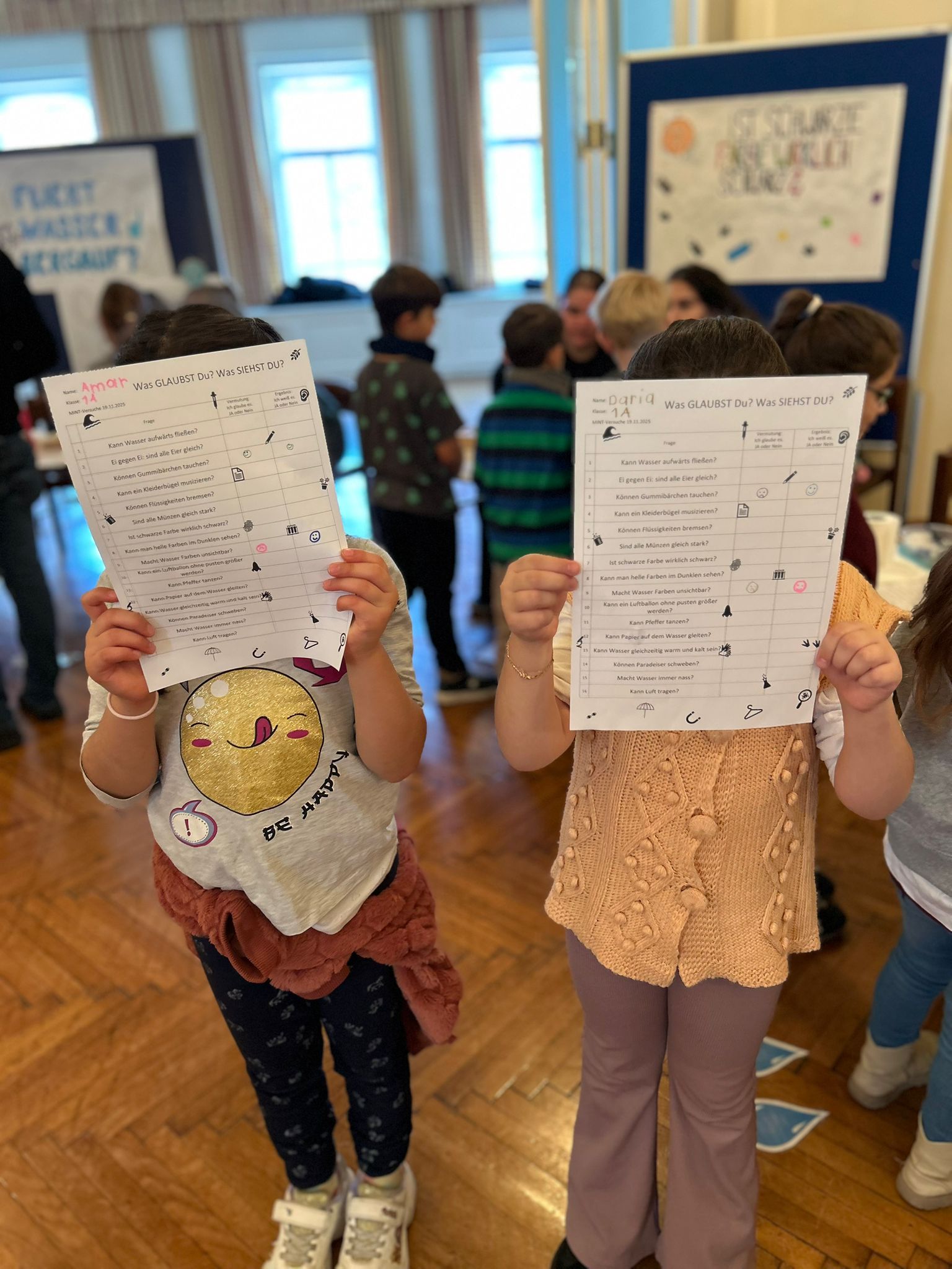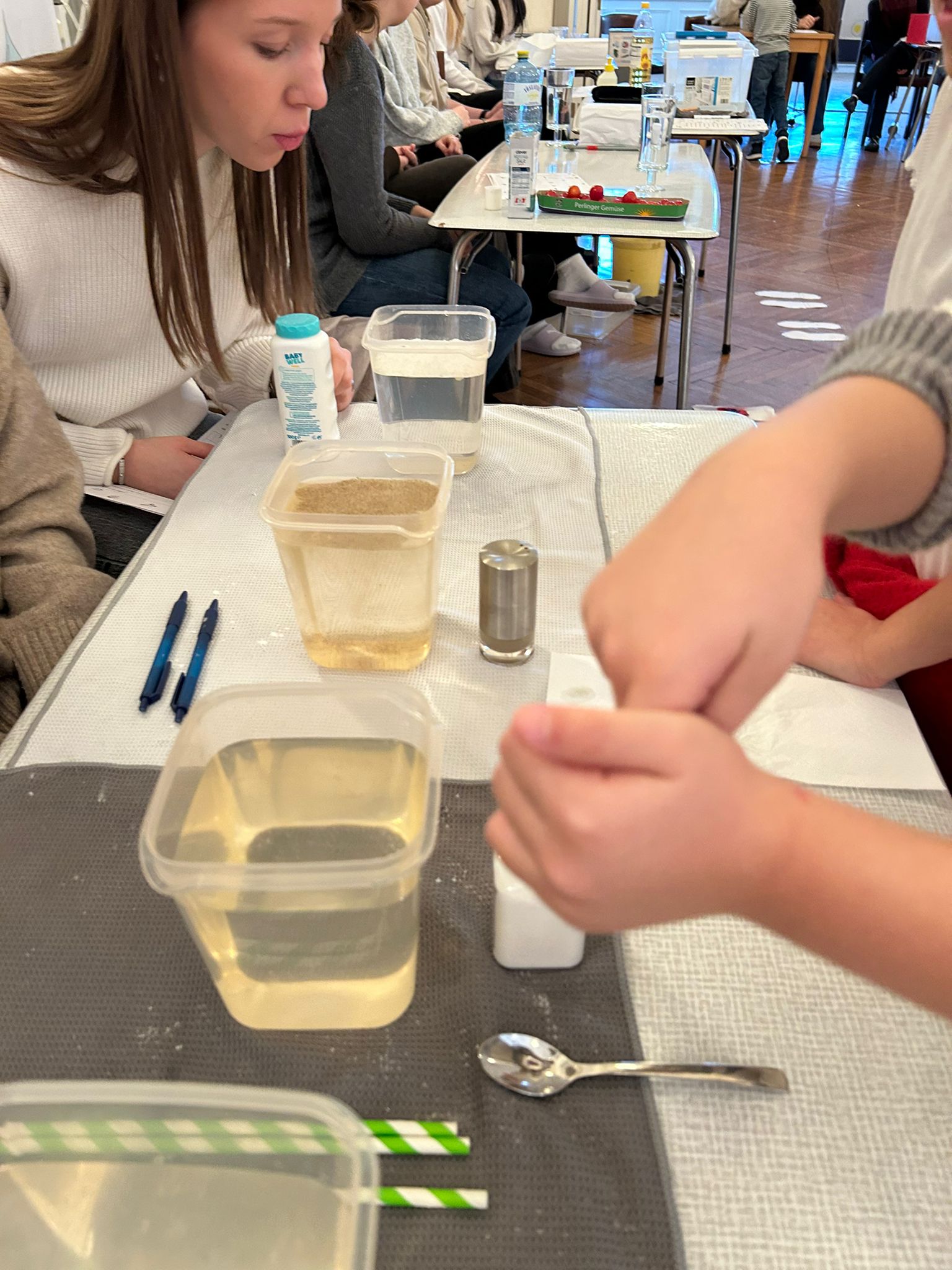 SchülerInnen unserer BAfEP hatten liebevoll und kompetent verschiedene Stationen im Festsaal vorbereitet, an denen unsere ersten Klassen experimentieren konnten: erst die Frage, dann die Hypothese, dann der Versuch und schließlich das Forschungsergebnis. Jetzt wissen wir zum Beispiel. Wasser ist nicht immer nass! Auf Luft kann man stehen! Und noch vieles mehr. Es war großartig! Danke, liebe Campus-PartnerInnen!