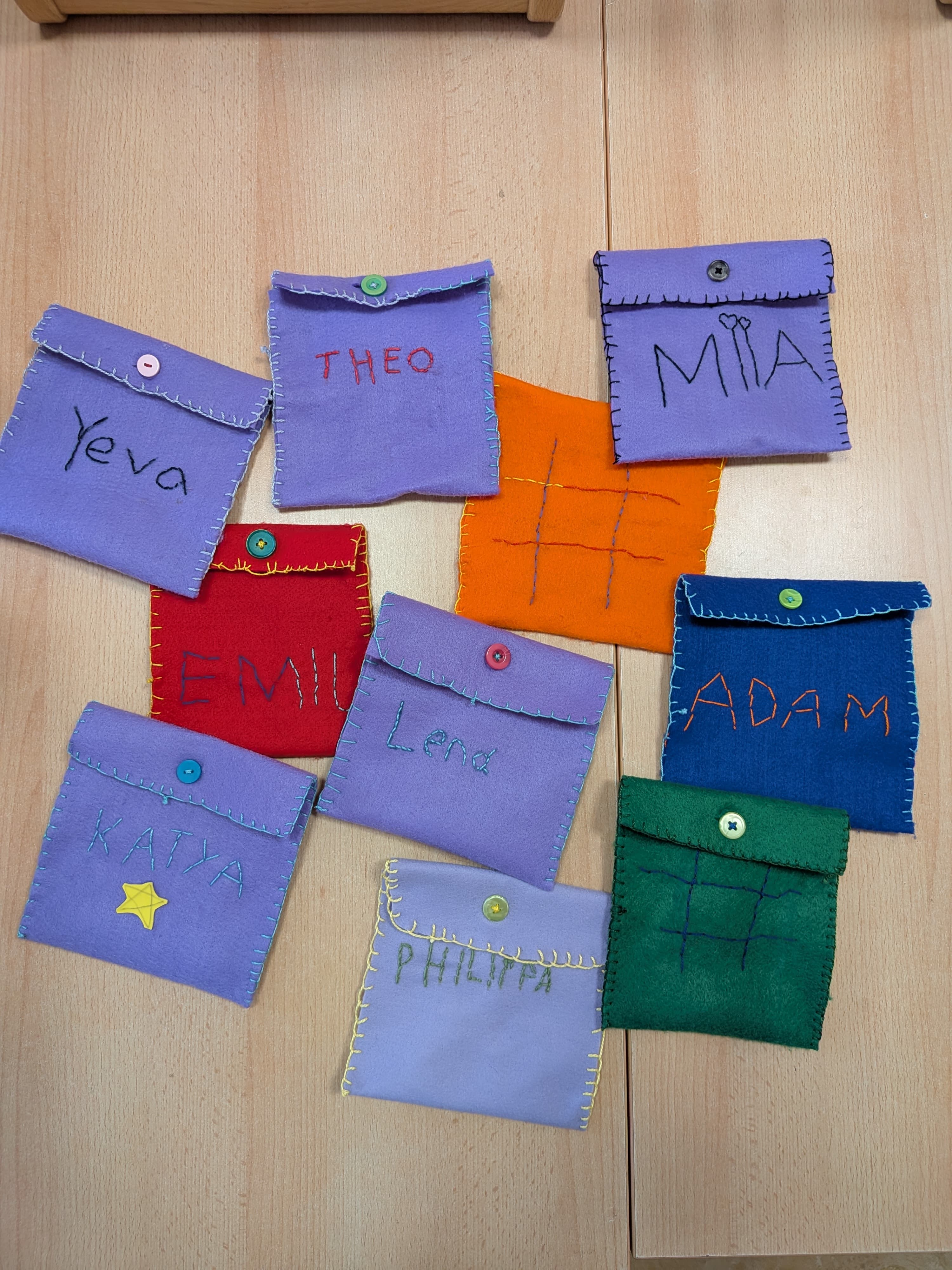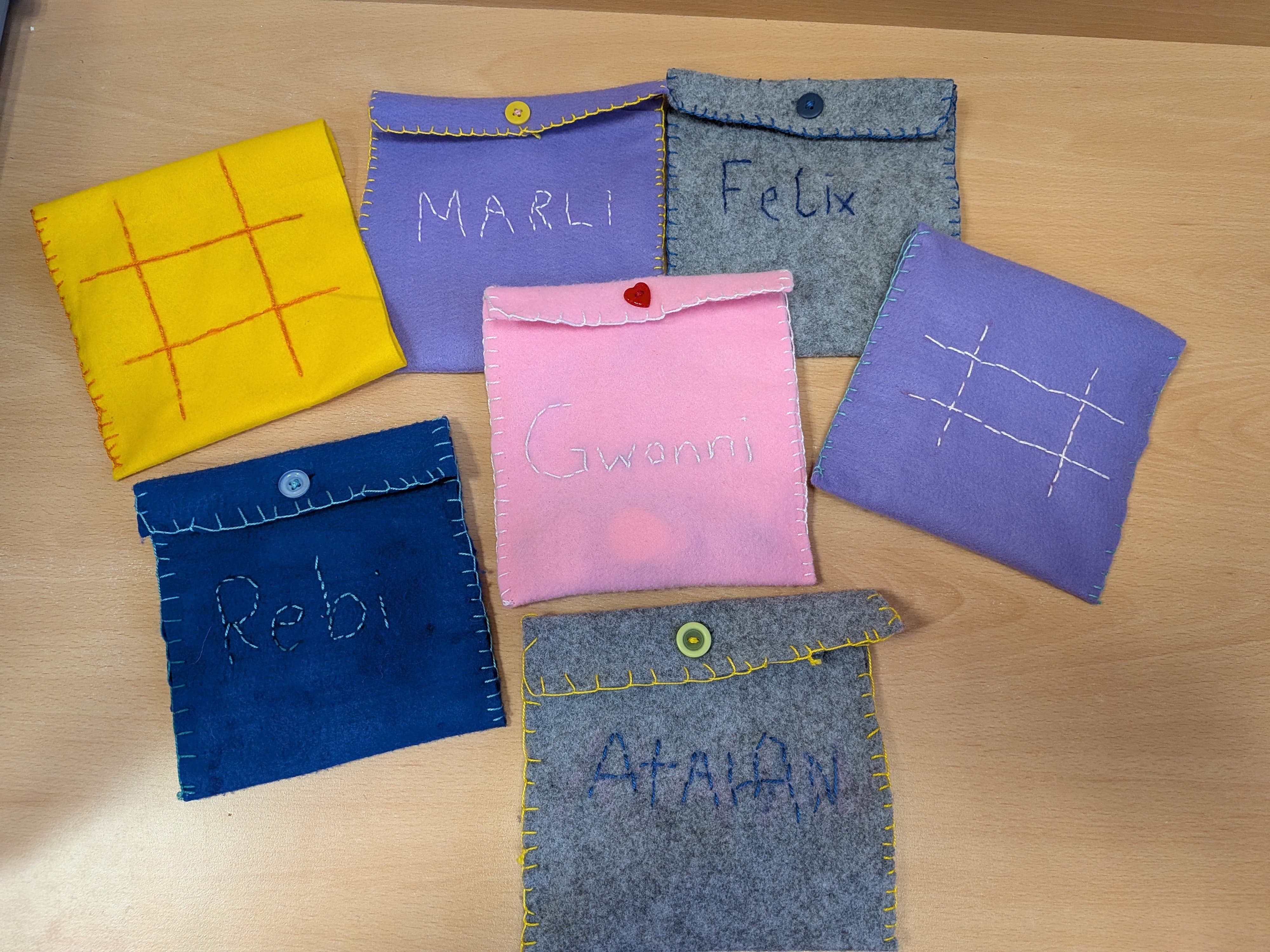 Bereits im November hatten die Kinder begonnen, kleine Täschchen aus Bastelfilz zu nähen. Dabei stickten sie nicht nur ihren Namen, sondern auch ein eigenes Tic-Tac-Toe-Feld. Das Spiel kann beginnen!
