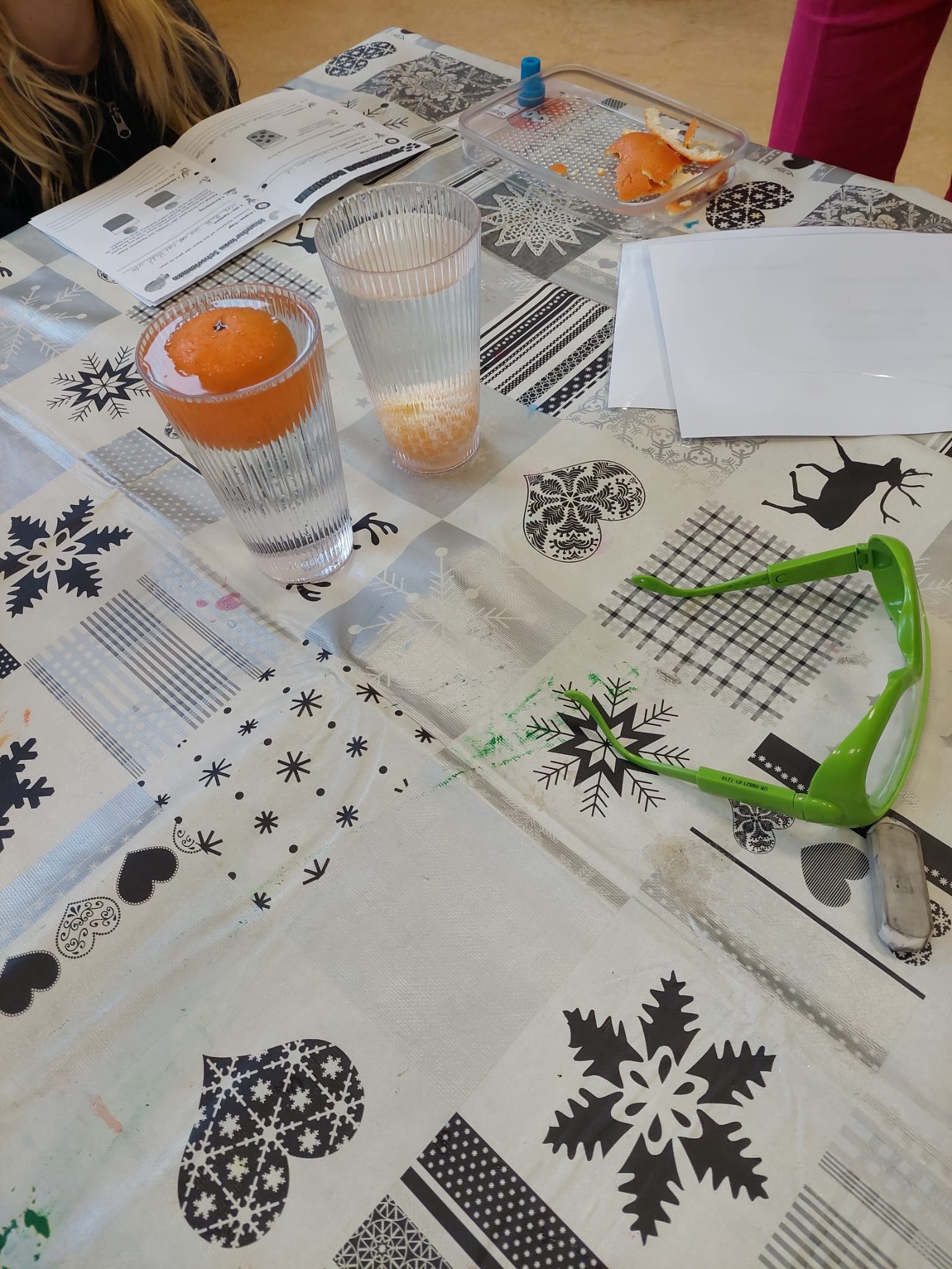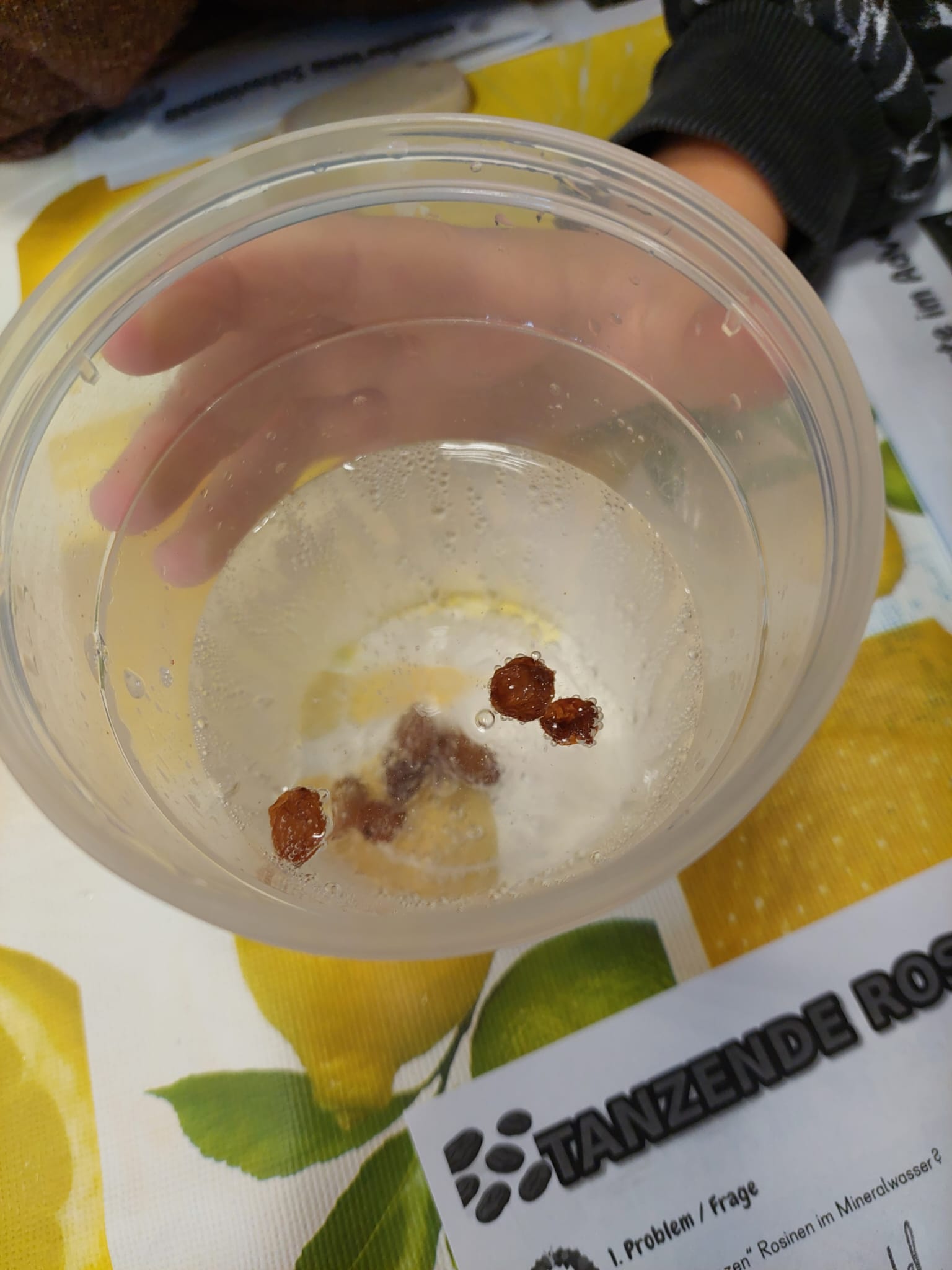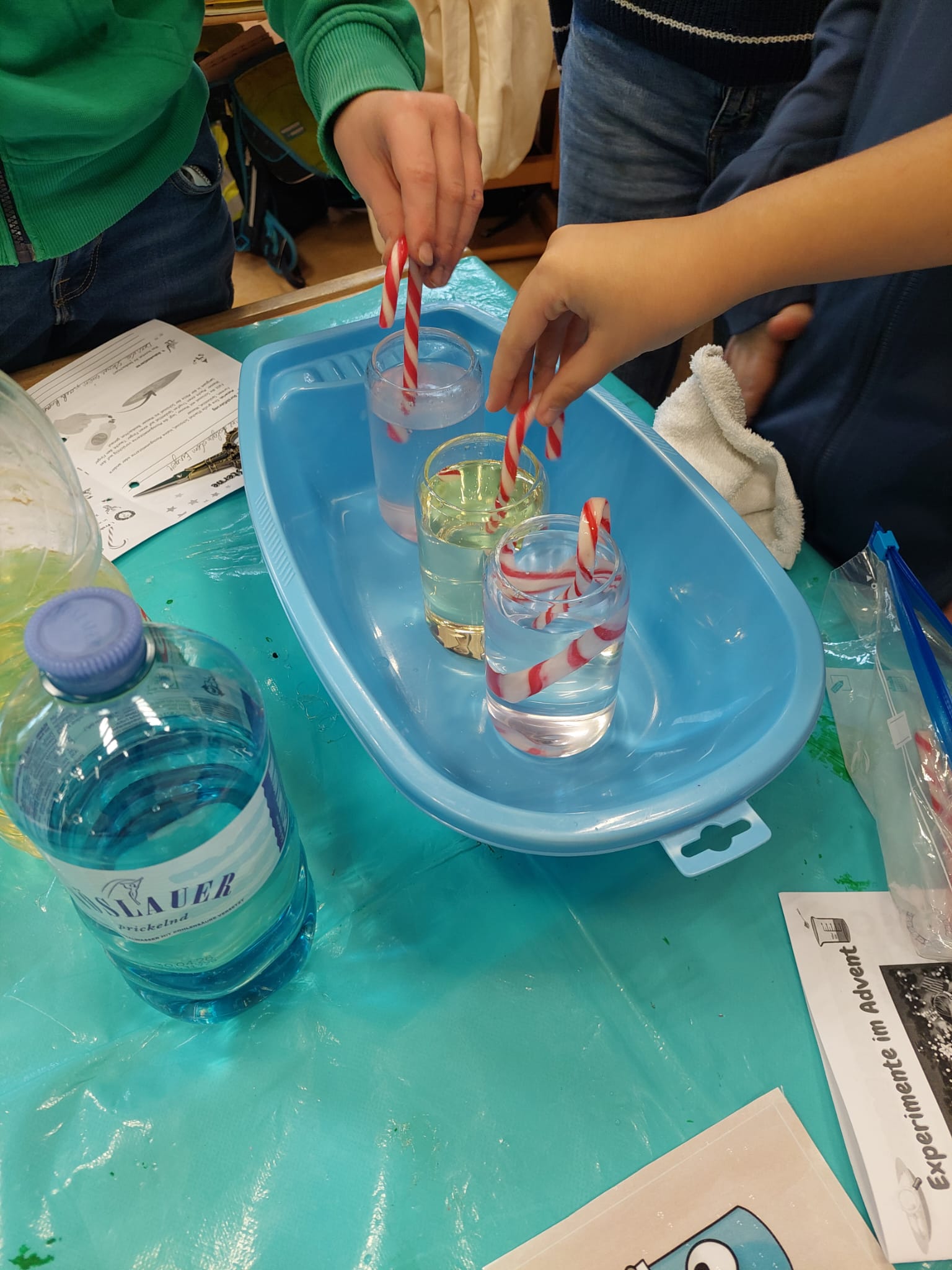 Es war wirklich spannend, was sie dabei entdecken durften: schwimmende und sinkende Mandarinen, die Löslichkeit von Zuckerstangen, tanzende Rosinen und Sterne - und die Kinder stellten selbst Schnee her (schön, denn draußen war der Novemberschnee schon wieder weg ...).