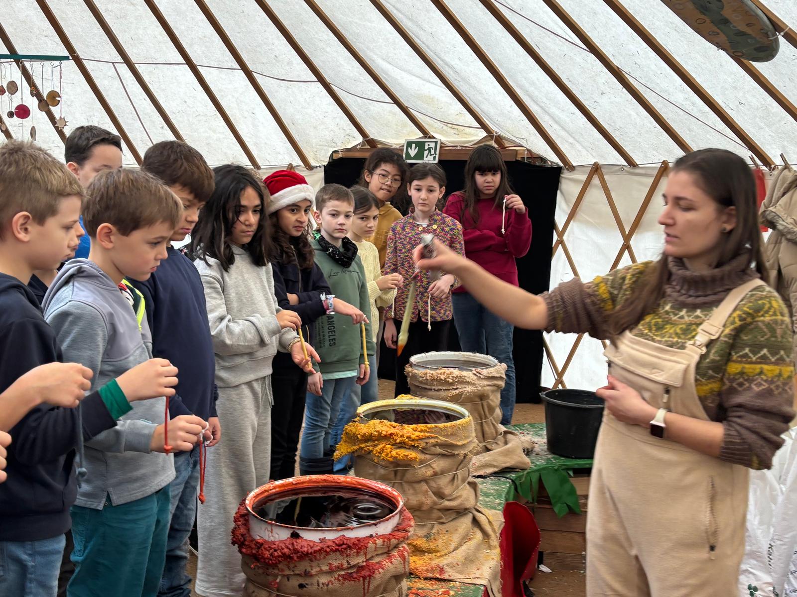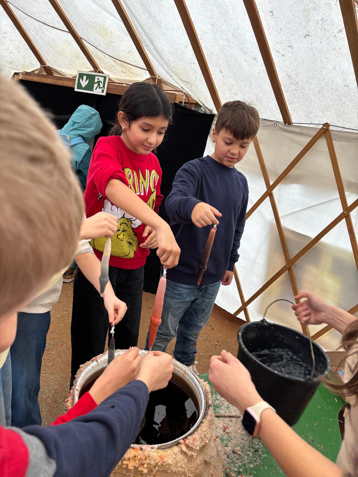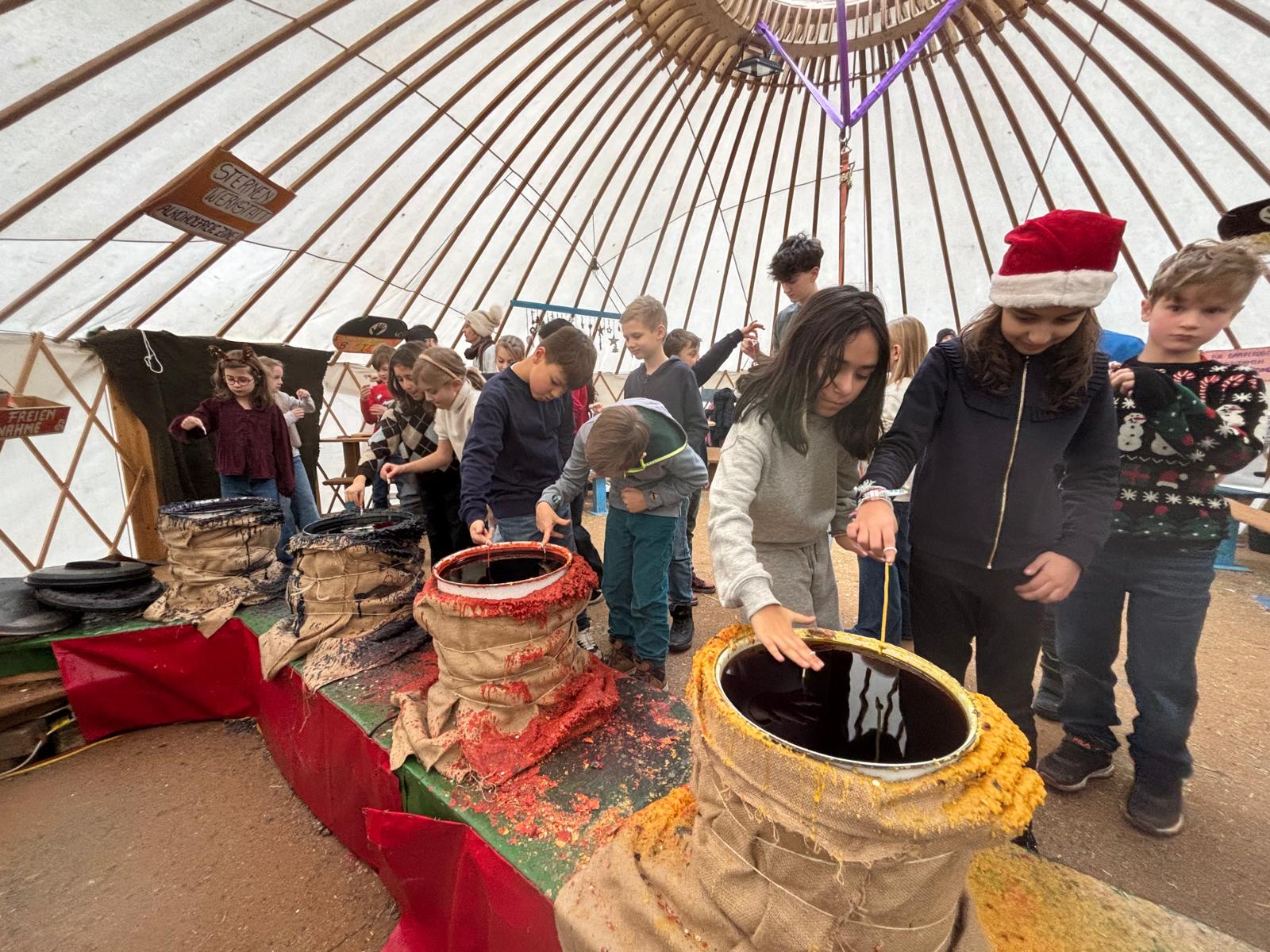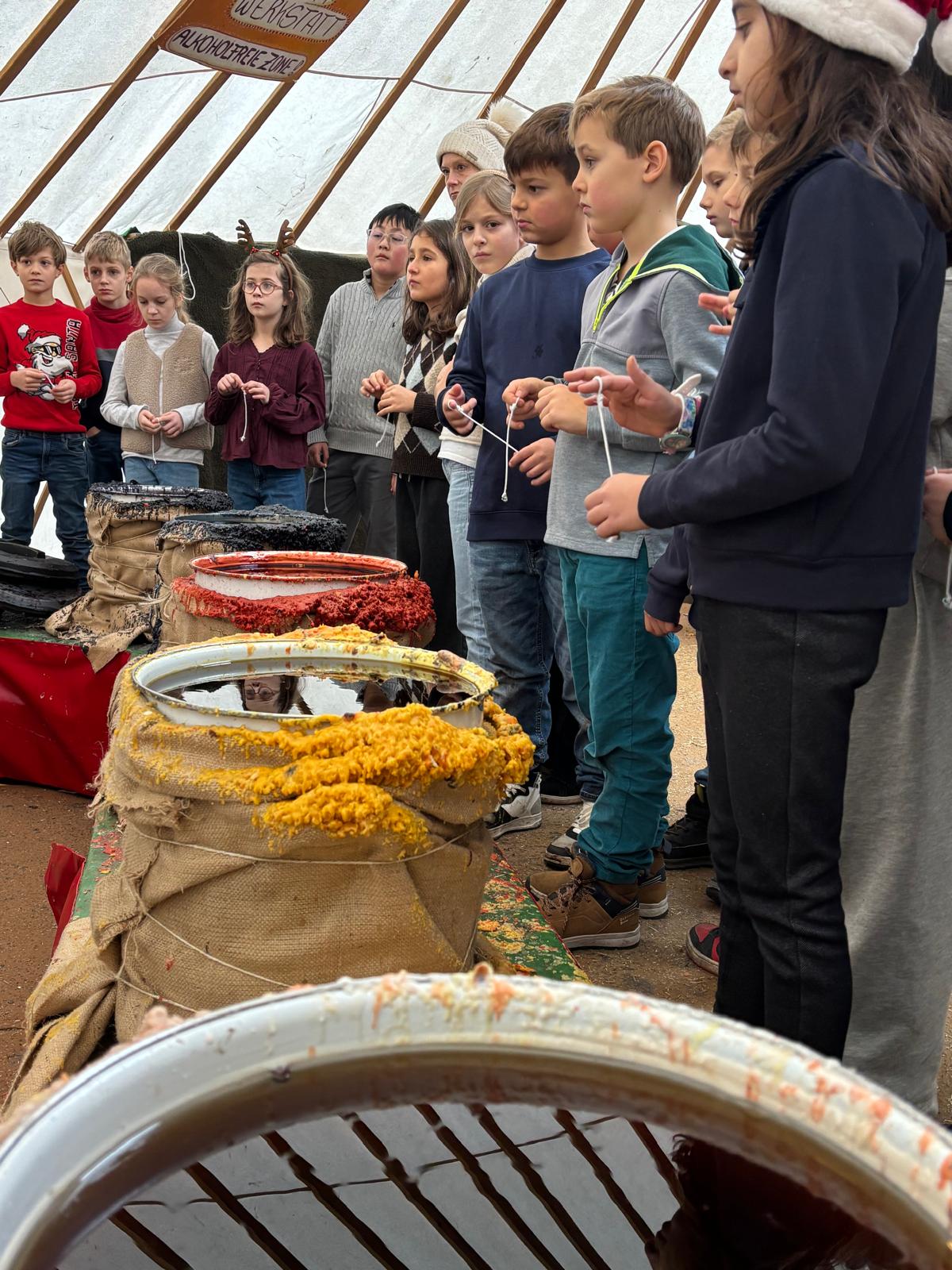 Auf dem Programm stand: Kerzenziehen. In einem gemütlichen Zelt tauchten die Kinder die Kerzendochte mit viel Geduld immer wieder in das heiße, duftende Bienenwachs. Schicht für Schicht entstanden so individuelle Kerzen als perfektes Weihnachtsgeschenk und als Erinnerung an einen gelungenen Ausflug!